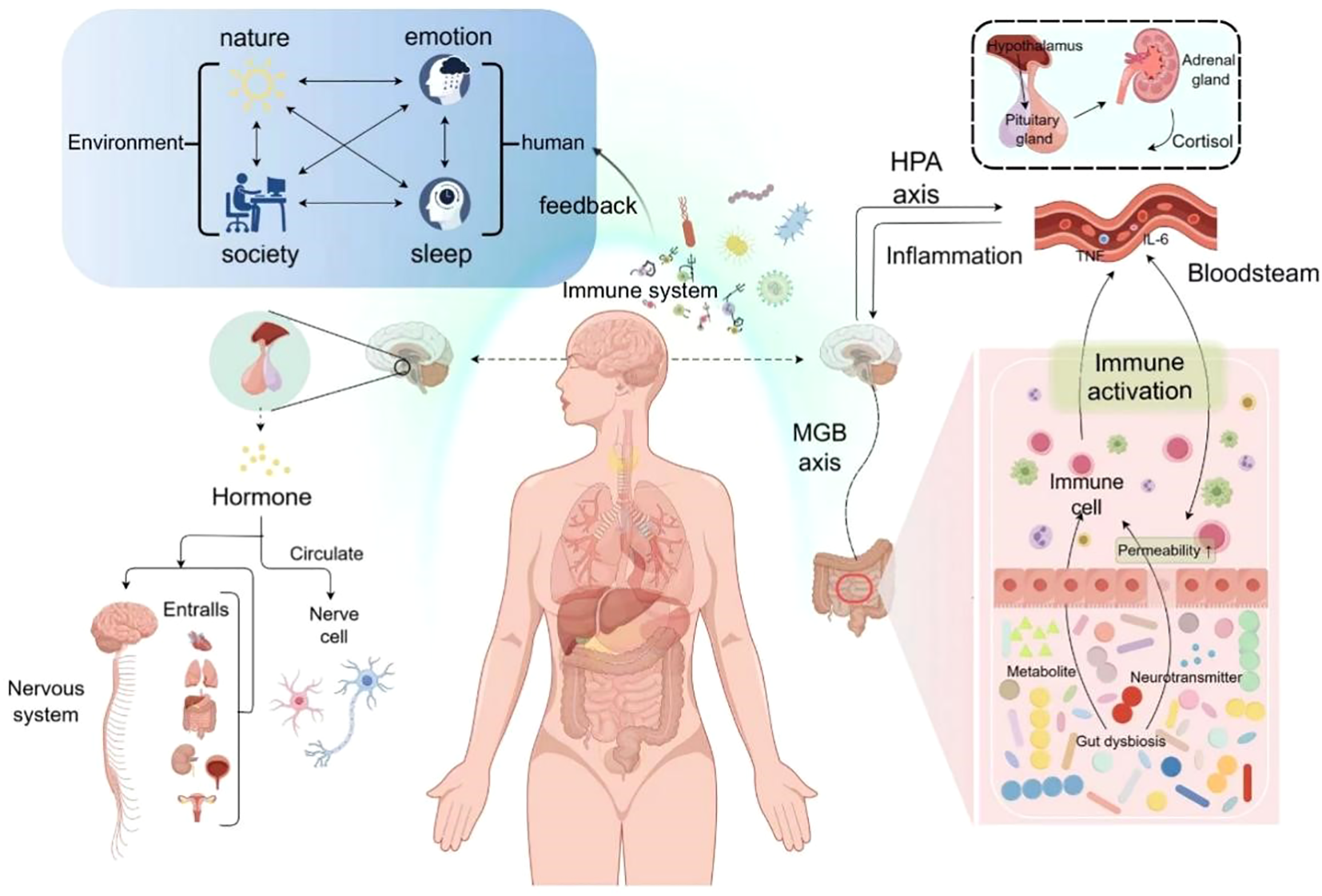 The scientific point of view regards the brain as an organ that regulates mental activity and emphasizes that the mind is a manifestation of brain function, i.e., a subjective and dynamic reflection of objective reality by the brain. In fact, the biological basis of mental activity covers the nervous system, the endocrine system, and genetic factors. The cerebral cortex, as a part of the nervous system, is the core material basis for the generation of psychological activities, and the organism relies on the nervous system to accomplish muscle movement, sensation, autonomous activities and hormone secretion. Psychological factors influence physiological and pathological processes in the body through the hypothalamus-pituitary-hormone (HPH) system. Broadly speaking, when psycho-behavioral and/or socio-environmental factors act, different areas of the brain become active accordingly. On the one hand, these activities stimulate the HPH system to produce hormones that act on the internal organs and the autonomic nervous system; on the other hand, the hormones have an excitatory or inhibitory effect on nerve cells through the blood circulation. Research has shown that psychological traits such as personality, temperament and abilities, as well as patterns of human behavior, are associated with genetic factors. Psychological activity has not only a biological basis, but also a social basis; that is, the psyche is a product of socialization formed under the influence of material and cultural conditions (69).