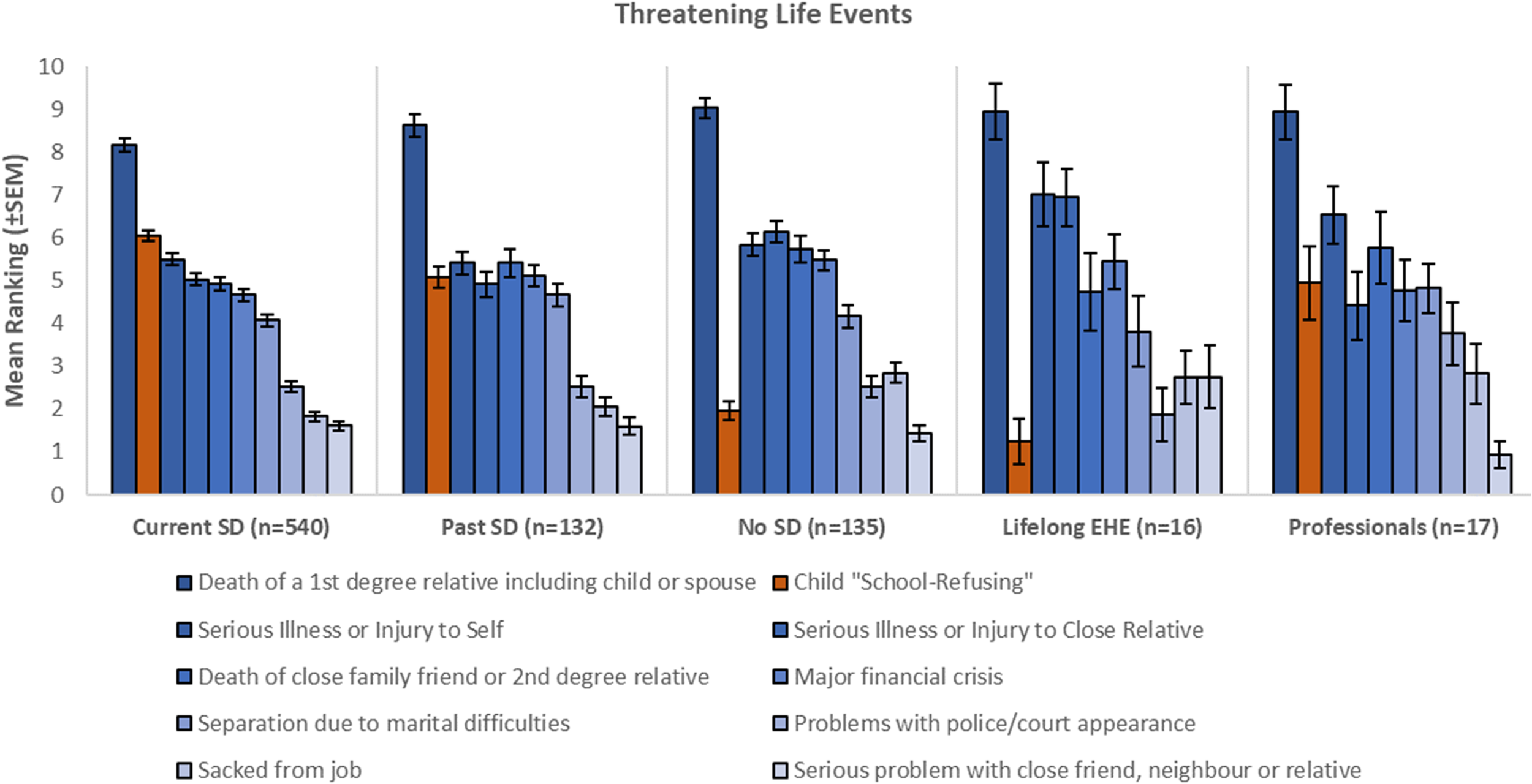 For scoring and analysis purposes, the most threatening life event selected by each participant was given a score of ‘10’, with the second most threatening scored ‘9’. This proceeded until the item ranked lowest within the selected 10 life events was scored ‘1’, after which all life events not selected within the top 10 were scored as ‘0’. These scores were used to compute an average score for each of the 18 items for each of the five groups respectively.