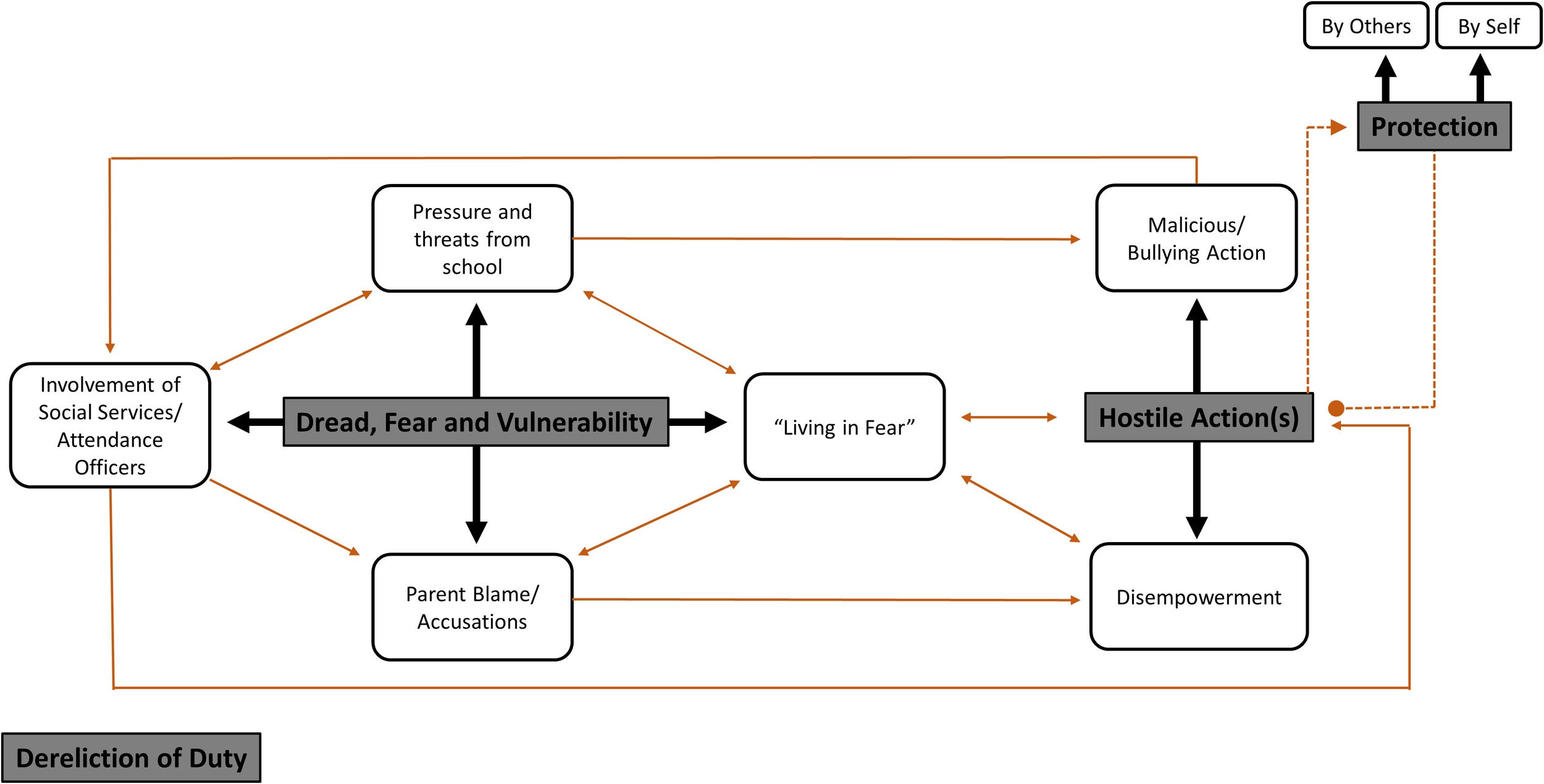 This study highlights a bleak, adversarial, and lonely picture for parents of CYP struggling to attend school. More specifically, the findings depict a system rife with parental blame; a system that appears to isolate parents through hostile, threatening, and punitive actions. A wider lack of societal understanding of the experience of School Distress further compounds this dearth of support for parents, placing parental mental health in further peril.