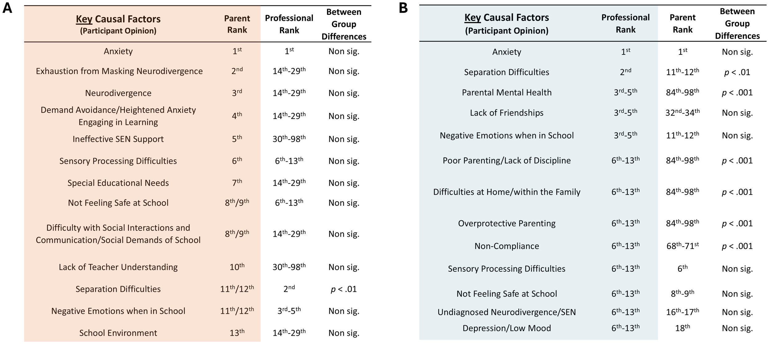 Despite the above, the weight of the clinical and academic evidence has focused on parental deficiencies as drivers of school attendance difficulties, with limited research in the psychological literature exploring the impact that having a child who experiences School Distress has on parents. This research sought to address this. By comparing the lived experiences of parents of CYP who have experienced School Distress with both parents of CYP who attend school without distress and parents of CYP who have never attended a school setting, we aimed to qualitatively explore the parental lived experience of School Distress and to quantitively assess the impact on their lives. The questions posed can be considered under five related categories: 1, the direct impact of parenting a child or young person experiencing School Distress on the parent themselves; 2, the interactions that parents have with others, including the professionals/services surrounding the child and family, and how these impact parental lived experiences and mental health; 3, action(s) taken against parents to enforce school attendance and the impact of these actions; 4, key causal factors underpinning School Distress; and 5, key sources of support available to participants supporting CYP with School Distress.