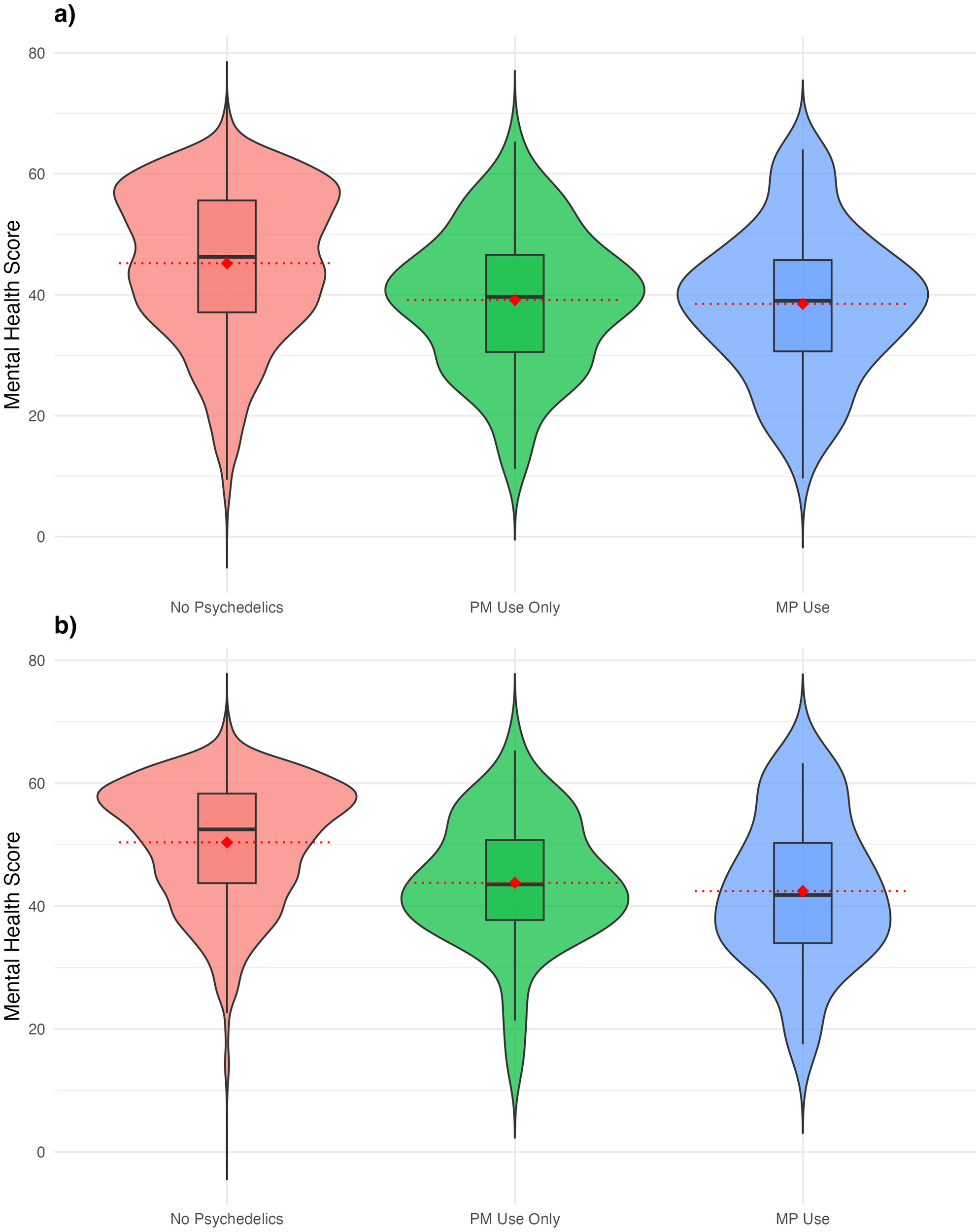 Comparisons of overall Mental Health Composite Scores. (a) Comparisons of overall Mental Health Composite Scores for PM users, MP users, and non-users of psychedelics. (b) Comparisons of overall Mental Health Composite Scores for PM users, MP users, and non-users of psychedelics without past-year experiences of depression or anxiety. Violin plots showing the mental health composite scores. Violin plots showing the mental health composite scores, stratified by past-year psychedelic use. (a) Represents all participants included in the data analysis and (b) represents participants without past-year anxiety or depression.