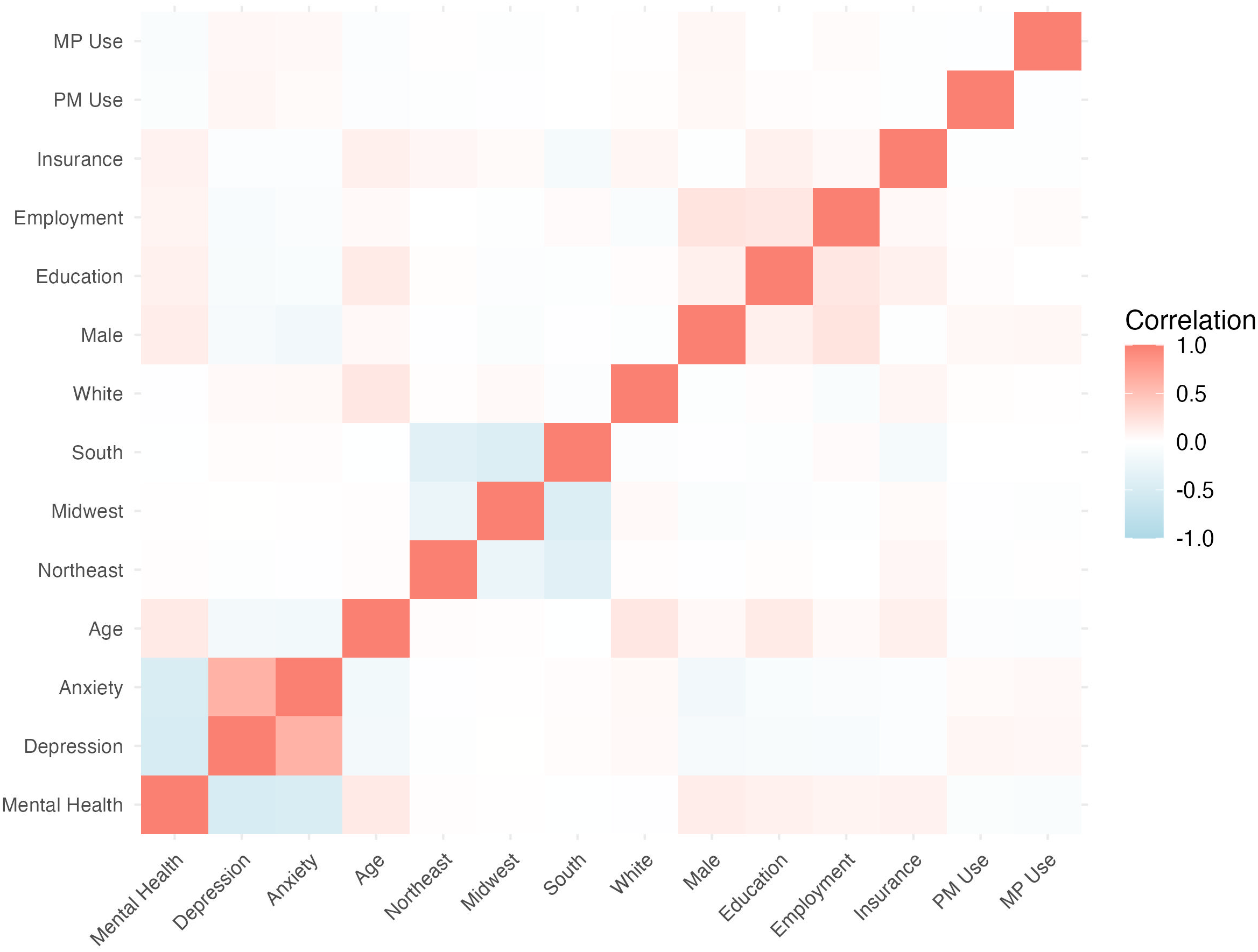 The ANOVA analyses showed statistically significant differences in the mean MCS between the three groups. A one-way ANOVA revealed a significant effect of psychedelic use on MCS, F(2,6086)=31.62,p<.001. In the Tukey’s HSD post-hoc analysis, the mean difference for No psychedelics vs. MP use was 6.71 (95% CI [4.16, 9.26], p<.001), indicating a significant difference between these groups. For No psychedelics vs. PM use, the mean difference was 6.09 (95% CI [3.42, 8.77], p<.001), also indicating a significant difference between these groups. Finally, when comparing the PM vs MP groups in the Tukey’s HSD analysis, the mean difference was 0.62 (95% CI [-3.05, 4.28], p=.918), which was not statistically significant. For both the ANOVA and the Tukey’s analysis, the results were consistent when adding anxiety/depression as a blocking variable to address potential confounding (Table 3). Using Bonferroni’s correction, there were statistically significant differences in MCS between both PM and MP groups for the total dataset population and for those without past year anxiety and/or depression (p<0.001). However, there were not statistically significant differences among groups for the population with past year anxiety and/or depression. A heatmap illustrated correlations between various demographic and mental health variables (Figure 2).