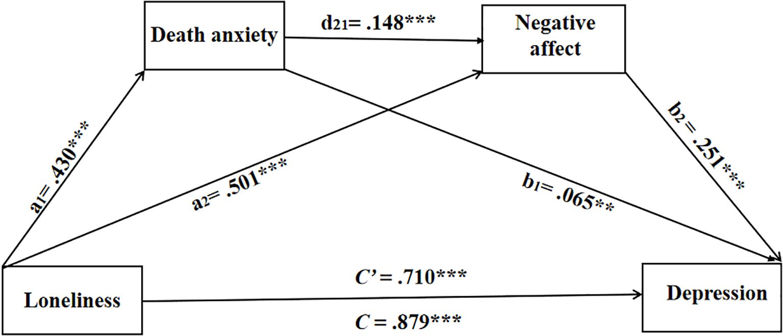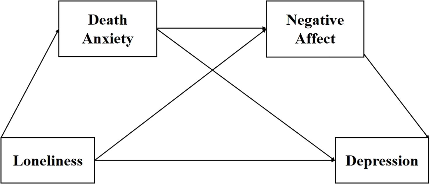 Conclusion: Our research offers valuable insights into the link between loneliness and depression throughout COVID-19. The findings not only enrich the empirical literature on mental health in the context of pandemics—by revealing the serial mediating role of death anxiety and negative affect—but also provide practical implications for targeted mental health interventions.
