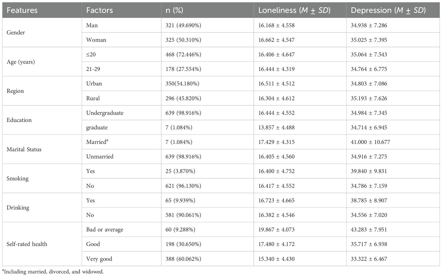 Regarding psychological health, the COVID-19 pandemic, considered a public health crisis, has led to the highest levels of stress and anxiety among people (1, 2). During COVID-19, new measures such as quarantine affected individuals’ daily routines and overall well-being, potentially causing increased feelings of loneliness, anxiety, and depression, as well as higher rates of insomnia, substance abuse, and self-harm or suicidal tendencies (3). As an unprecedented global crisis, it has profoundly affected people’s daily lives worldwide, not only through the threat of COVID-19 death but also through a significant rise in mental health problems observed in China and globally, as documented in various studies (4–6). Similarly, this public health crisis has inevitably had a serious impact on individuals’ psychological health, resulting in stress symptoms, fear of death, and depression (7–11), among medical staff (12), and university students (13, 14). During the pandemic, loneliness was widespread among isolated people (15) and particularly common among college students (16, 17). Research indicates that chronic or severe loneliness can easily lead to psychological and behavioral problems or worsen mental health (18–20).