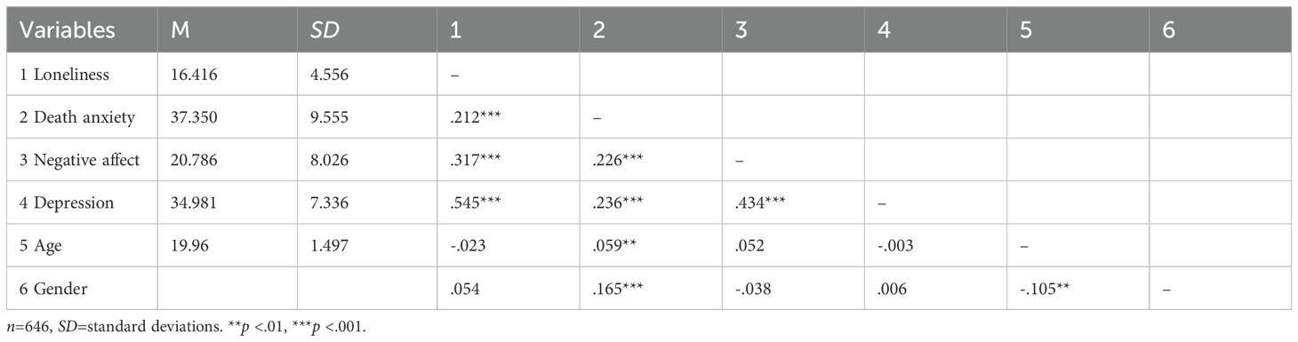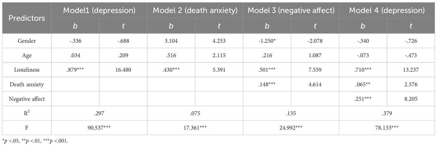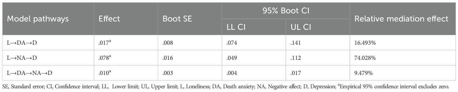 The mean score of negative affect was 20.786 (SD=8.026). This mean is below the midpoint of the total score range (30), suggesting that the participating college students experienced moderately low overall negative affect during the study period. The SD indicates that while most students maintained relatively stable negative emotional states, a small number may have reported higher negative affect (e.g., sadness, worry, or anger) due to pandemic-related stressors (e.g., academic disruption or uncertainty about the future). As shown in Table 2, negative affect exhibited the strongest correlation with depression (r=.434, p <.001) among all mediators, and also correlated positively with loneliness (r=.317, p <.001) and death anxiety (r=.226, p <.001). This confirms that negative affect serves as a key “amplifier” linking loneliness and death anxiety to depression—consistent with emotion processing theories (57), which argue that unregulated negative emotions exacerbate cognitive biases and depressive symptoms.