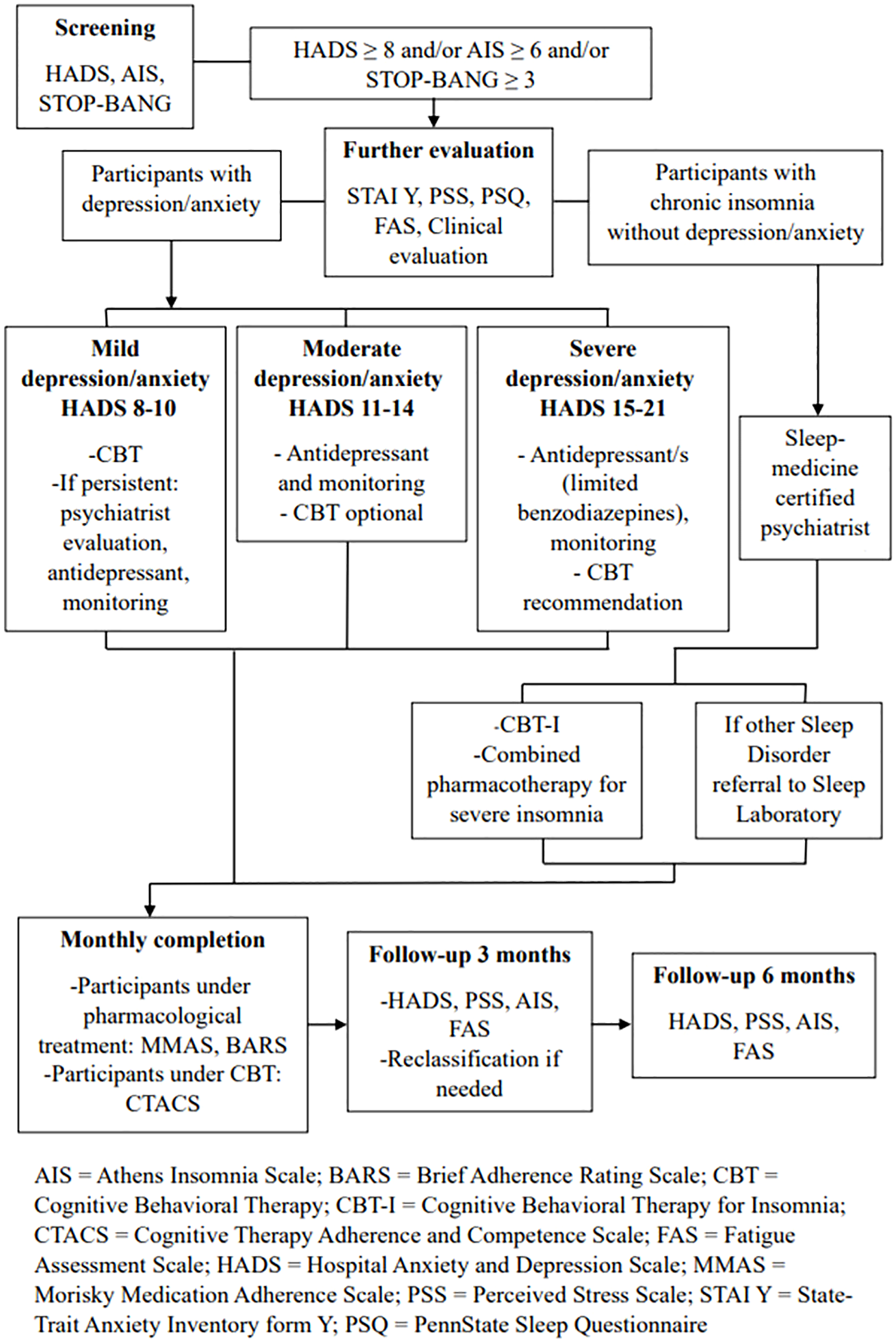 Participants with other sleep disorders as indicated by history, such as sleep apnea, for the detection of which the STOP-Bang screening tool is used (scores > 2 indicate the presence of sleep apnea), or other disorders (restless legs, parasomnias, etc., based on the PennState Sleep Questionnaire), are referred to sleep experts in their area and the necessary diagnostic and therapeutic measures are initiated.