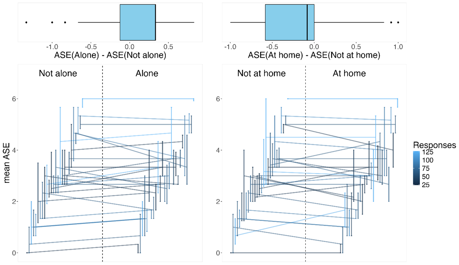 On the bottom: the horizontally shifted vertical lines represent interquartile ranges in two social contexts of the mean anomalous self-experience (ASE; for each patient). The patient-specific median ASEs in these contexts are connected by lines to connect the patient-specific data and to indicate the difference in the contexts: not alone versus alone and not at home versus at home. On the top: the differences in the medians for each patient in the two social contexts are illustrated via boxplots.