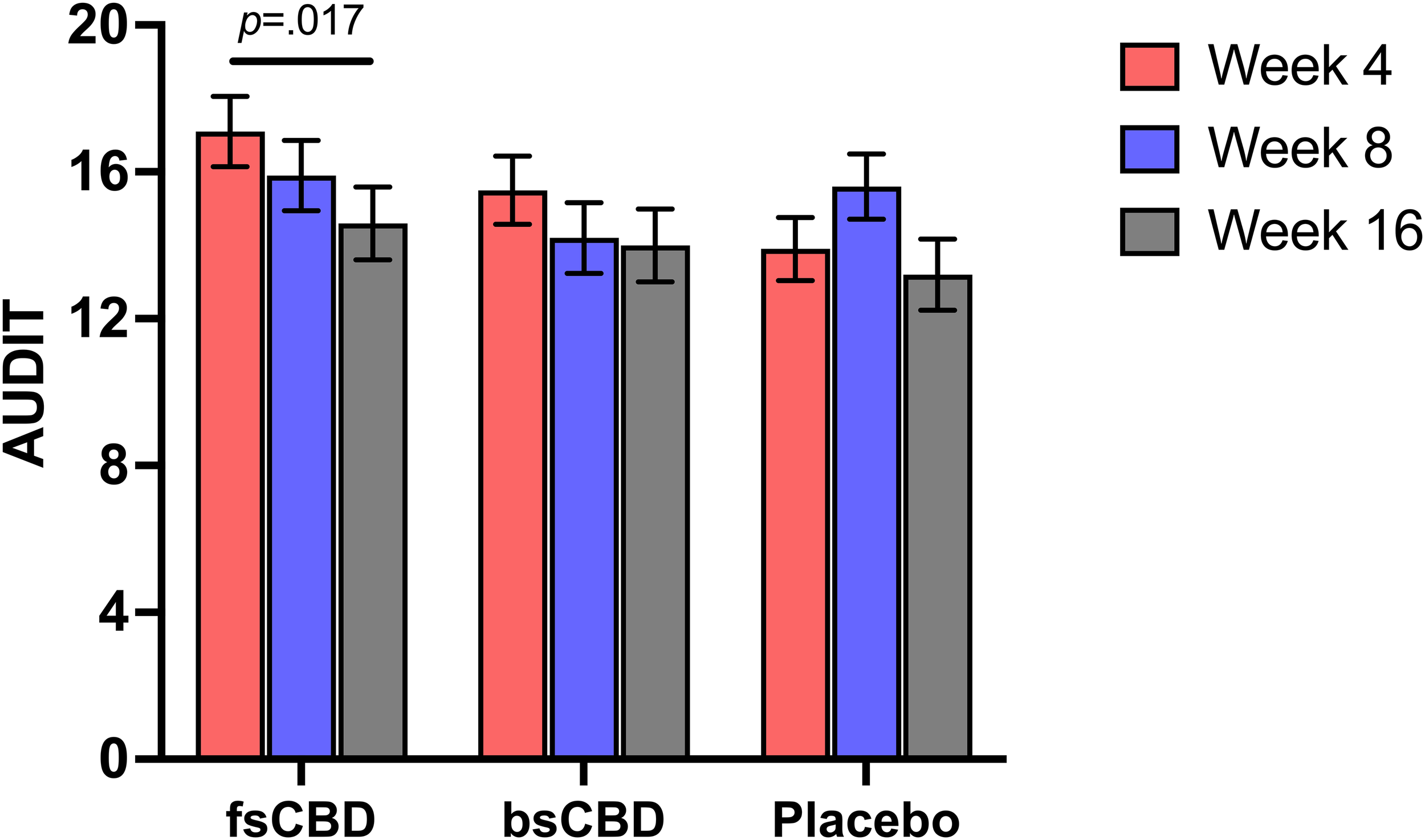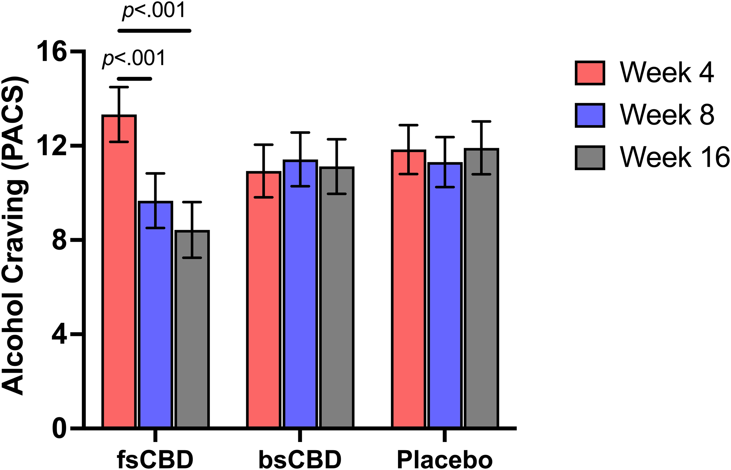 Analyses of attrition and side effect data indicated no significant differences across conditions, suggesting that both bsCBD and fsCBD were well tolerated. Individuals receiving fsCBD demonstrated reductions in craving but no reduction in drinks per drinking day.