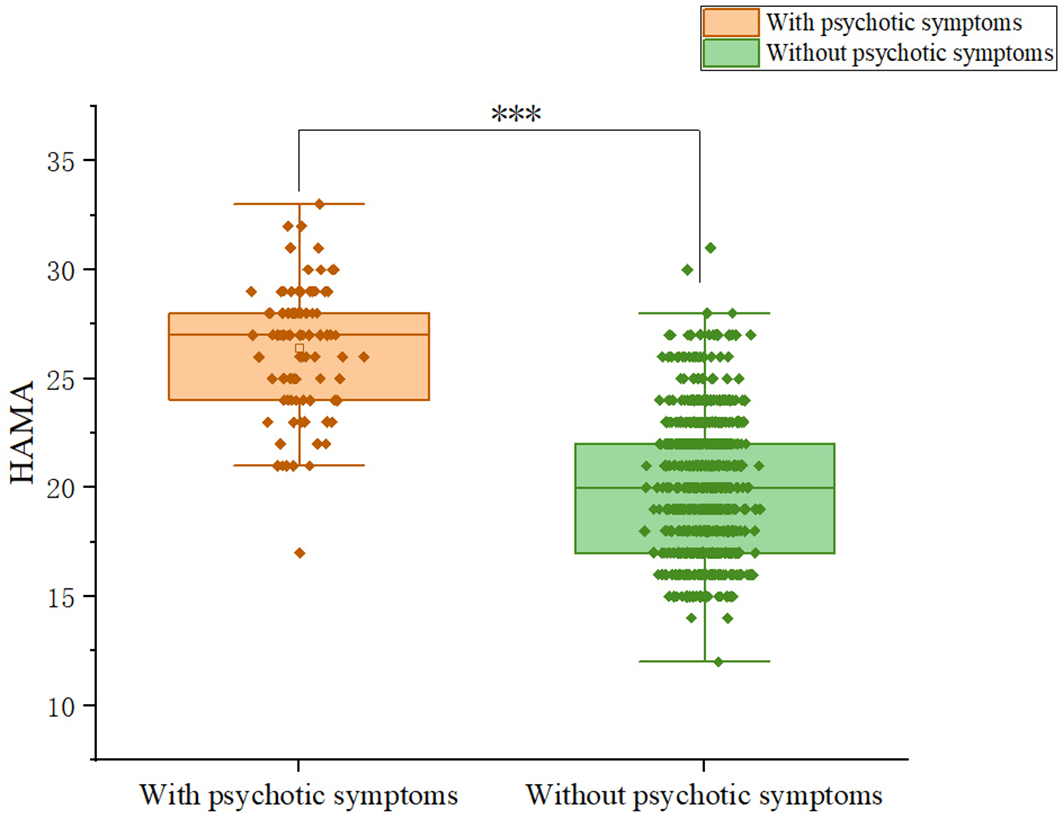 Patients with somatic symptoms disorder had a 10.2% (92/899) prevalence of psychotic symptoms. Among patients, 9.59% (28/292) of males and 12.42% (64/515) of females exhibit psychotic symptoms; the difference was not significant (χ2 = 1.19, p = 0.275).We compared and presented the demographic and clinical characteristics of patients with and without psychotic symptoms in Table 1. We observed significant differences between the psychotic and non-psychotic patient groups with respect to the following variables: HAMD (Z = -11.374, p<0.001), HAMA (Z= -13.577, p<0.001), PSS total score (Z=-9.394, p<0.001). Patients with psychotic symptoms exhibited higher levels of anxiety and depression than patients without psychotic symptoms. In addition, patients with psychotic symptoms experienced more severe stress than patients without psychotic symptoms. Figures 1-3 display the significant differences in HAMD, HAMA, and PSS total scores, with the corresponding levels of significance marked.