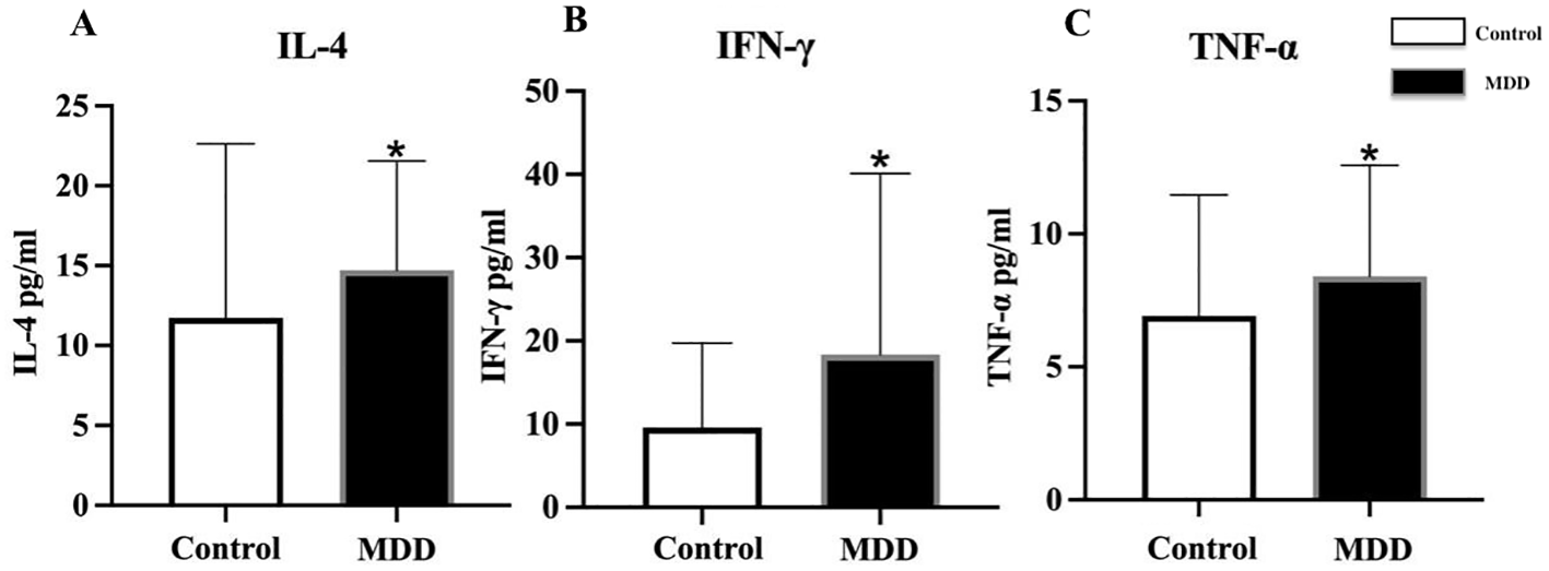 Comparison of serum inflammatory factor levels between adolescents with depression and healthy controls. MDD, major depressive disorder; Control, healthy control group; IL-4, interleukin-4; IFN-γ, interferon-γ; TNF-α, tumor necrosis factor-α. *indicates p < 0.05 compared with Control. All inflammatory factors are presented as mean ± standard deviation. Differences in serum (A) IL-4, (B) IFN-γ, and (C) TNF-α between healthy controls and MDD adolescents.