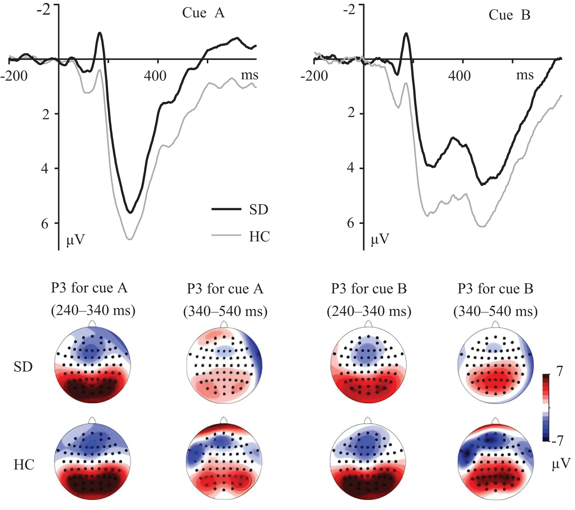 Repeated-measures analyses of variance (ANOVAs) with group (SD and HC) as between-subject factor and cue (A and B) as within-subject factor were performed on the mean amplitude of 240–340 and 340–540 ms. Repeated-measures ANOVAs with group (SD and HC) as between-subject factor and trial type (AX, AY, BX, and BY) as within-subject factor were performed on RTs and accuracy, and the mean amplitude of probe-N2 and probe-P3, respectively.