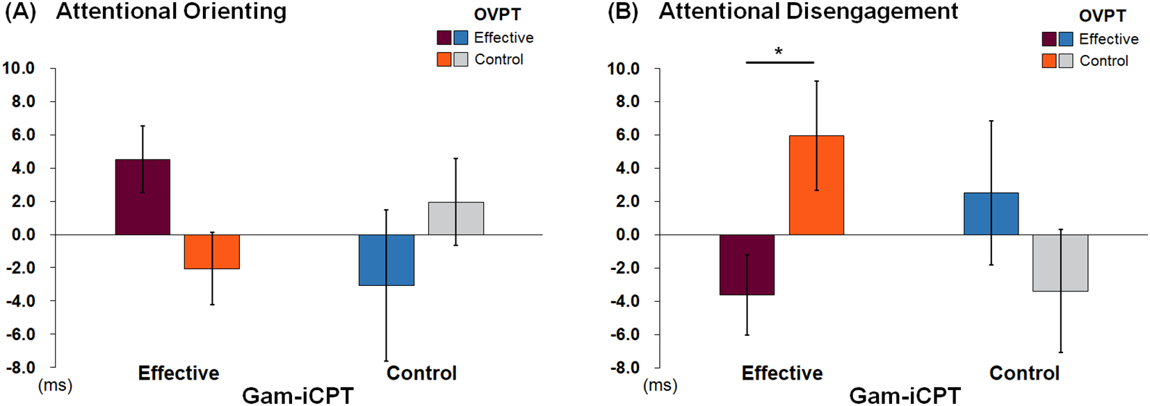 For attentional disengagement, we observed no significant main effects of emotion, gam-iCPT, or OVPT, Fs < 2. We also did not observe significant two-way interactions between emotion and gam-iCPT, or emotion and OVPT, Fs < 1, nor a three-way interaction, F < 1. However, we found a significant interaction between gam-iCPT and OVPT, F (1, 124) = 4.86, p = .029, ηp2 = .038 (Figure 2B). Follow-up simple effects analyses indicated that, among participants who received the effective gam-iCPT, the effective OVPT (mean = -3.62, sd = 13.69) resulted in faster disengagement compared to the control OVPT (mean = 5.94, sd = 18.579), F (1, 124) = 3.71, p = .056, ηp2 = .029. In contrast, among participants who received the control gam-iCPT, there was no effect of OVPT, F (1, 124) = 1.42, p = .24.