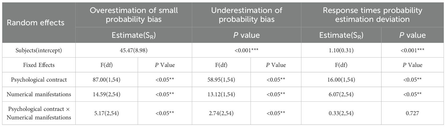 There was a significant difference in the effect of psychological contract fulfillment on the probability estimation bias of decision events, whether in small probability events [19.2 (95% CI 8.5, 29.8), p<0.001] or in large probability events [−21.2 (95% CI −41.7, −0.5), p<0.05] (Figure 2). In small probability events, the interaction between psychological contract fulfilment and “X%” was significant [38.6(95% CI 20.1, 57.1), p<0.001];the interaction between psychological contract fulfilment and “X−in−100” was significant, both in small probability events [40.7(95% CI 4.1, 77.3), p<0.05] and large probability events [−54.8(95% CI −86.3, −23.4), p<0.001]; and the interaction of psychological contract fulfilment and “1−in−X” was significant. Both in small probability events [19.2 (95% CI 8.5, 29.8), p<0.001] and large probability events [−21.2 (95% CI −41.8, −0.5), p<0.05].
