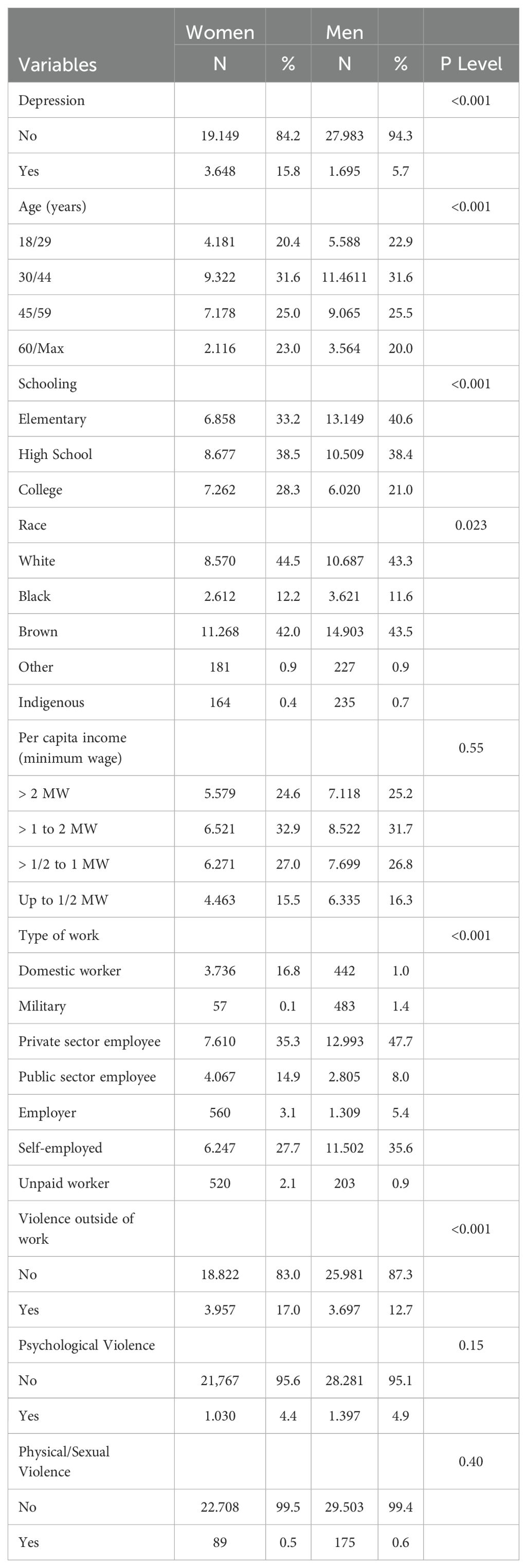 A descriptive analysis was conducted, and all variables were categorized. Data were shown for men and women. Logistic regression models were employed to estimate crude and adjusted odds ratios (ORs) along with their respective 95% CIs for the association between the two types of WPV and depression. The adjusted multivariate model for each type of violence included variables that were significantly associated with our outcome in the bivariate analysis (p-values < 0.05). The multivariate analysis was performed using the stepwise backward procedure. Thus, variables that initially had p-values ≤ 0.20 in the bivariate analysis were, simultaneously, included in the model. Variables with p-values > 0.05 were progressively removed from the model. The final model included only variables with p-values < 0.05. The differences between men and women in the association between WPV and depression were analyzed with interaction tests. Gender-interaction terms were analyzed with the total sample of participants (men and women). Statistical analyses were conducted using STATA 16 software. We applied the svy command, which specifies survey data analysis procedures in Stata, to incorporate the complex sampling design of the PNS 2019 (i.e., stratification, clustering, and sampling weights) and produce population-level weighted estimates. All estimates were weighted based on the sample complexity of the PNS 2019 (weighted total sample size = 159,171,311).