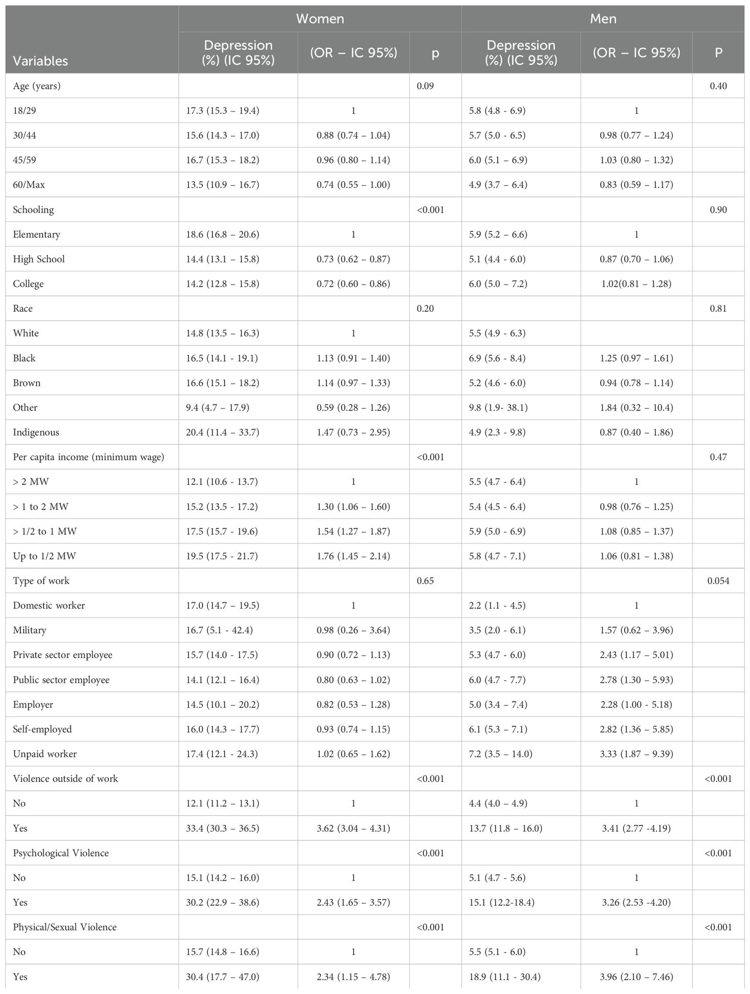 As shown in Table 2, for women, the sociodemographic variables showing higher prevalence of depression were self-reported race “indigenous” (20.4%), having elementary schooling (18.6%), and per capita income up to 50% of minimum wage (19.5%). For men, the sociodemographic variables showing a higher prevalence of depression were self-reported race “other” (9.8%) and being engaged in unpaid work (7.2%). Depression was more prevalent among women (33.4%) than men (13.7%) who reported violence outside of work. Depression was prevalent among men who reported psychological violence at work (15.1%, 95% CI 12.2–18.4) and physical/sexual violence at work (18.9%, 95% CI 11.1–30.4) and was highly prevalent among women who reported psychological violence at work (30.2%, 95% CI 22.9–38.6) and physical/sexual violence at work (30.4%, 95% CI 17.7–47.0). In the bivariate analysis, the following variables were associated with a higher risk of depression among women: lower per capita income, elementary schooling, violence outside of work, and all types of violence at work (psychological: OR: 2.43, 95% CI 1.65–3.57 and physical/sexual: OR: 2.34, 95% CI 1.15–4.78). For men, the variables associated with a higher risk of depression were type of work, with all types except military showing a higher risk in comparison with domestic work; experiencing violence outside of work; and all types of violence at work (psychological: OR: 3.26, 95% CI 2.53–4.20 and physical/sexual: OR: 3.96, 95% CI 2.10–7.46) (Table 2).