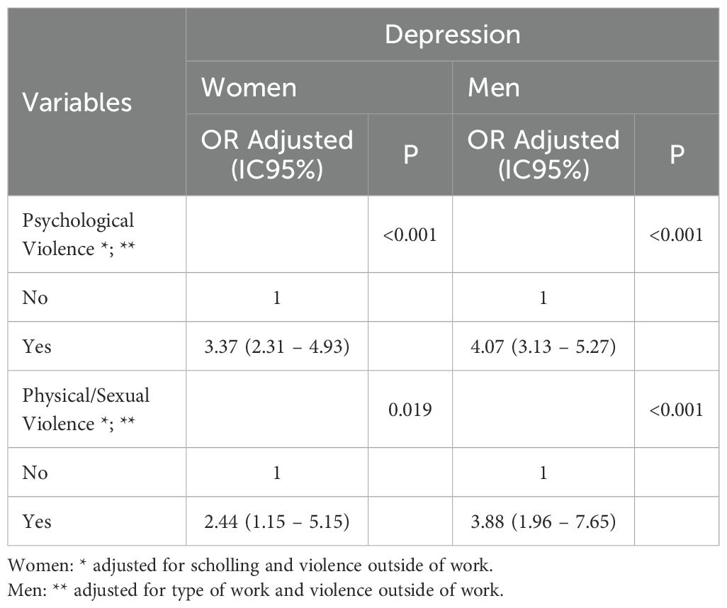Methods: We used a cross-sectional study using data from the Brazilian National Survey (PNS, 2019), a population-based study. A sample of 52,475 workers (18–98 years old; N = 22,797 women and 29,678 men) answered a questionnaire covering sociodemographic data, workplace violence (psychological and physical or sexual) in the last 12 months, and the Patient Health Questionnaire-9. Logistic regression models were performed and adjusted for sociodemographic factors. All analyses were conducted using weighted and stratified data by gender.