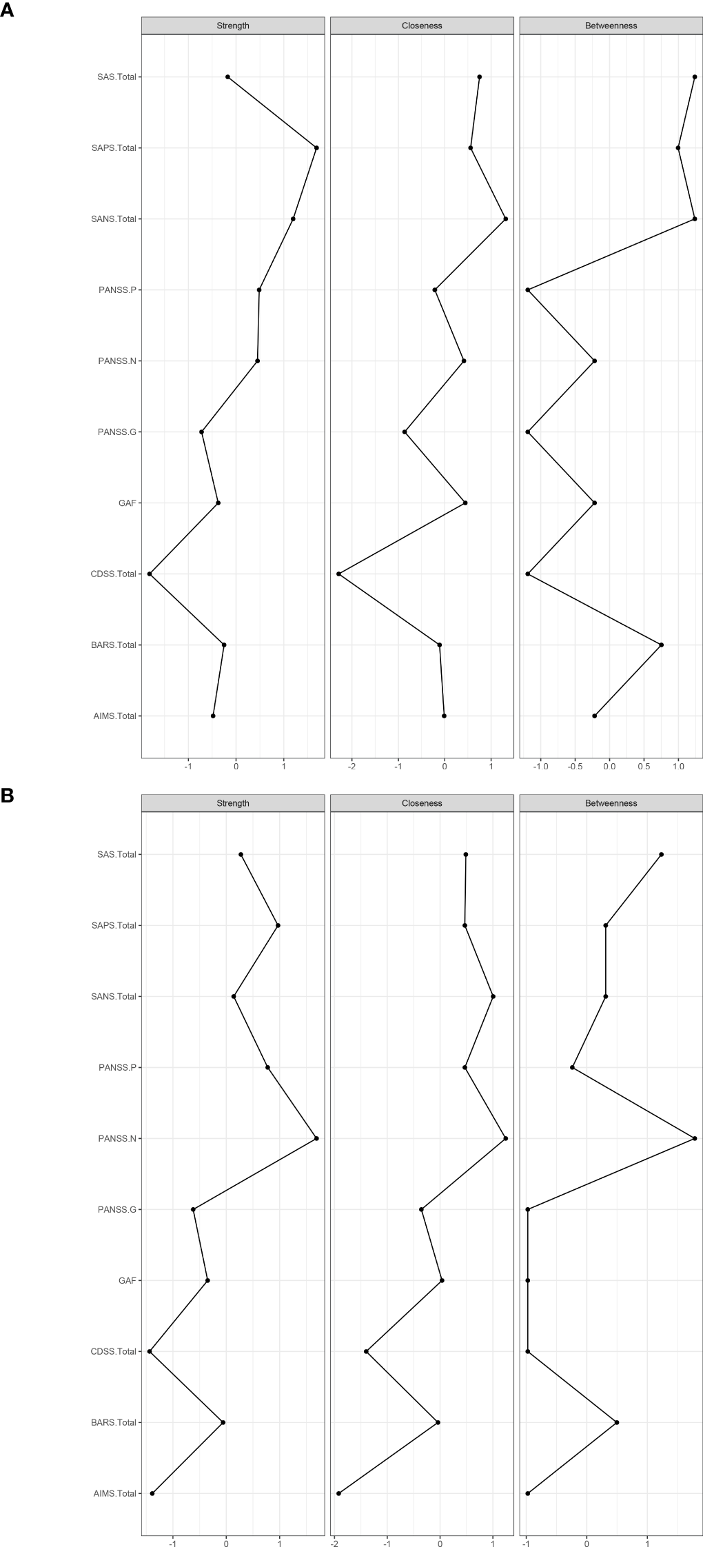 Centrality indices of symptoms (standardized z-scores). Centrality indices of symptoms of TRS (A), and Centrality indices of symptoms of NTRS (B).