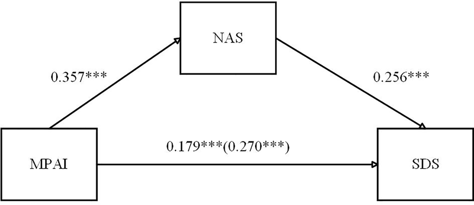 For the sample population, MPAI’s mean was 28.76 ± 12.22, NAS’s mean was 22.99 ± 7.53, and SDS’s mean was 4.53 ± 4.26. Furthermore, our study examined gender differences across research variables, as indicated by Table 2. The mean MPAI score among males was significantly higher than that among females, with males scoring significantly higher in specific dimensions, including uncontrollability, escapism, withdrawal symptoms, and inefficiency. Conversely, females scored considerably higher than males on the SDS.
