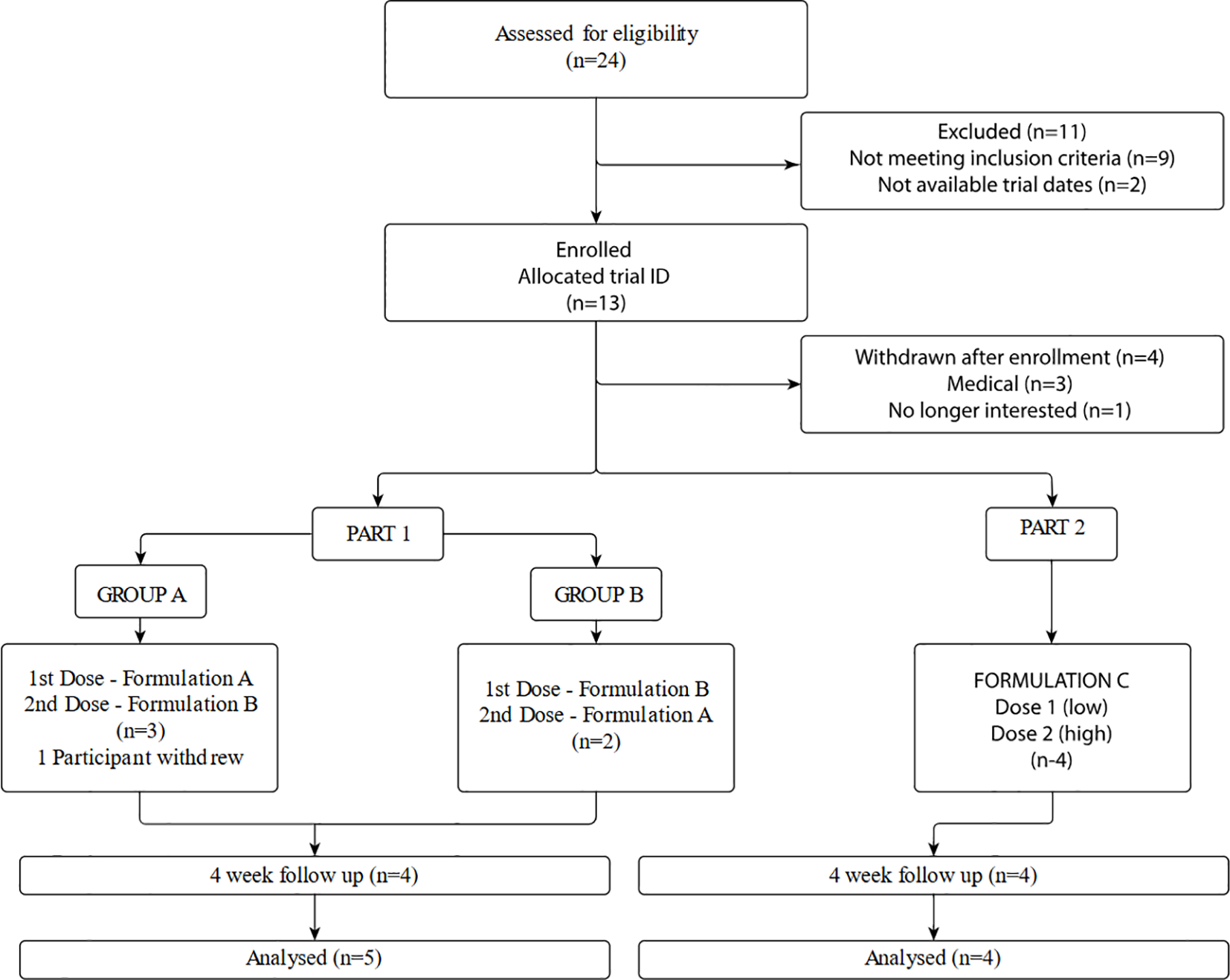 Recruitment took place between December 2022 and November 2023. Potential participants were recruited from professional networks, via word of mouth, and self-referral. Twenty-four participants were screened for eligibility by phone. Participants who were deemed to meet broad eligibility criteria attended an in-person screening visit for clinical assessment and informed consent. Reasons for exclusion and subsequent trial enrolment and disposition are shown in Figure 2.