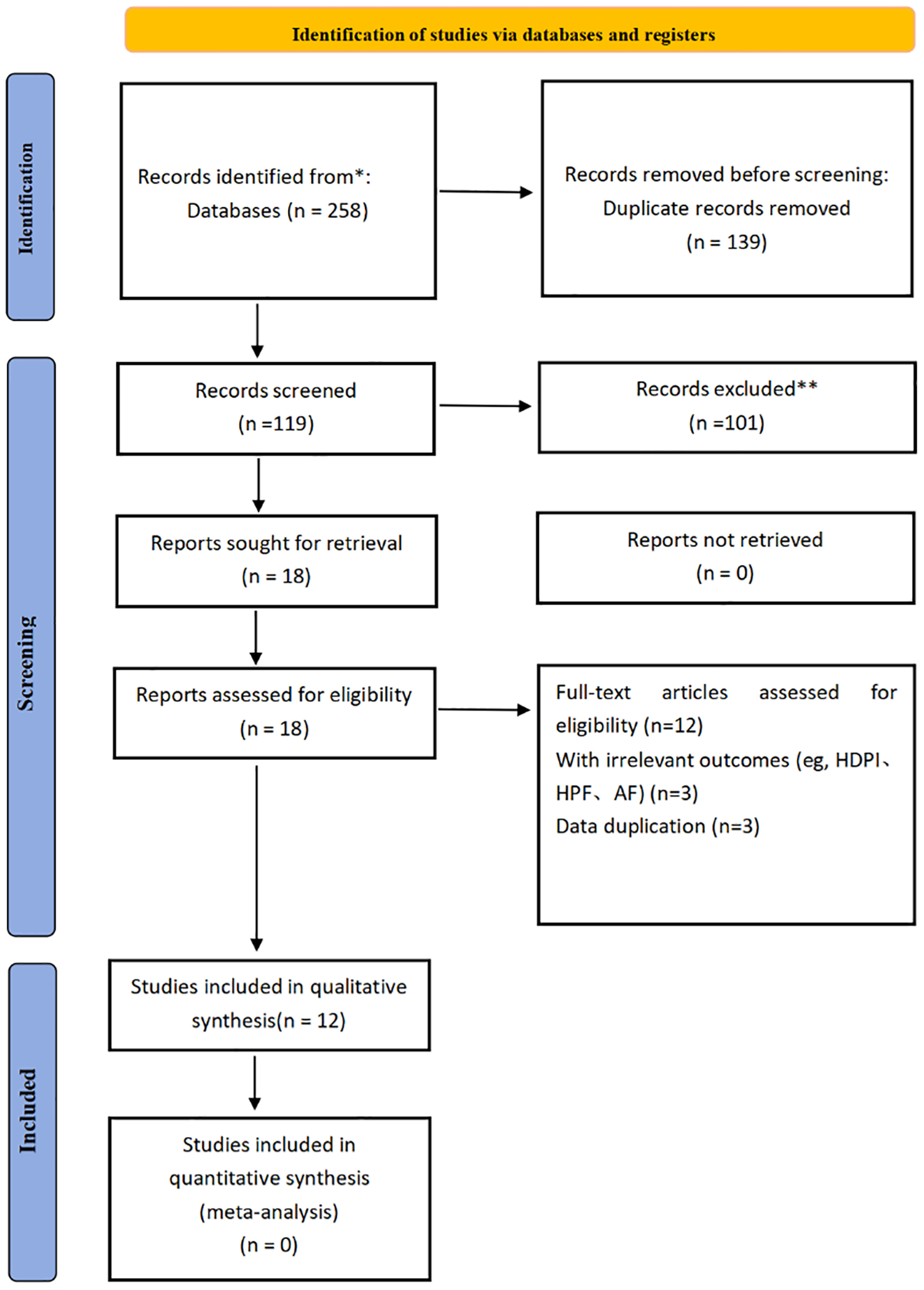 The literature screening process was divided into two stages. In the initial phase, two researchers (TJW and ZSP) were responsible for collecting the relevant literature. All the literature collected was entered into EndNote X9 and duplicated items were automatically and manually removed. Eligible studies were identified by reviewing the title and abstract against the set inclusion and exclusion criteria. In the second stage, the studies in question are evaluated through a full-text review to determine which studies are suitable for inclusion in the meta-analysis. In the literature screening process, if two researchers have different opinions, a third researcher (LC) will be invited to participate in the discussion until a consensus is reached (see the attachment for detailed screening process).