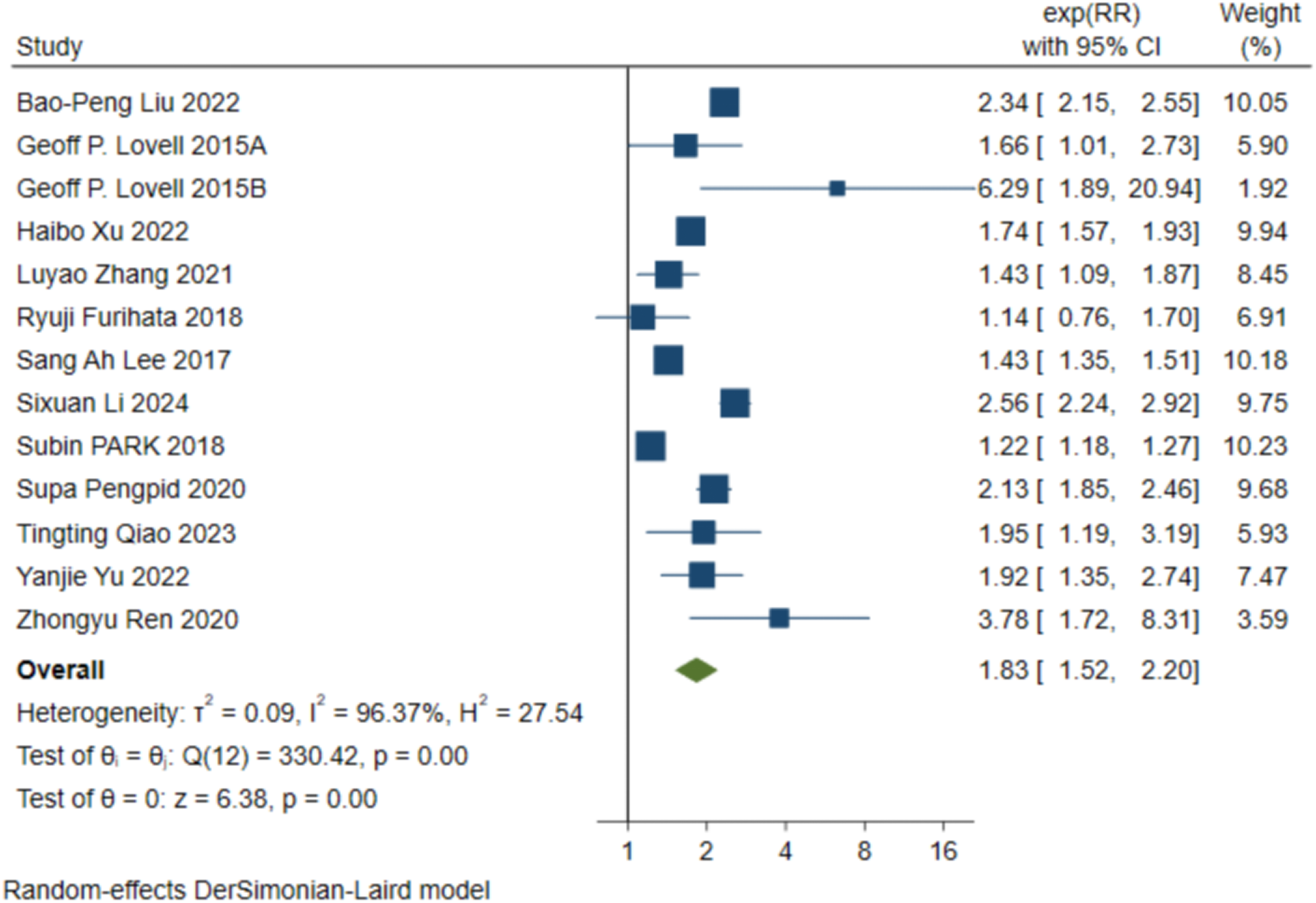 Twelve studies included an association between skipping breakfast and depression; The results showed that skipping breakfast increased the risk of depression (RR=1.83, [95%CI 1.52-2.20], τ2: 0.09, I2: 96.37%). Heterogeneity was high among studies. See Figure 2 for a graph of the relevant data.