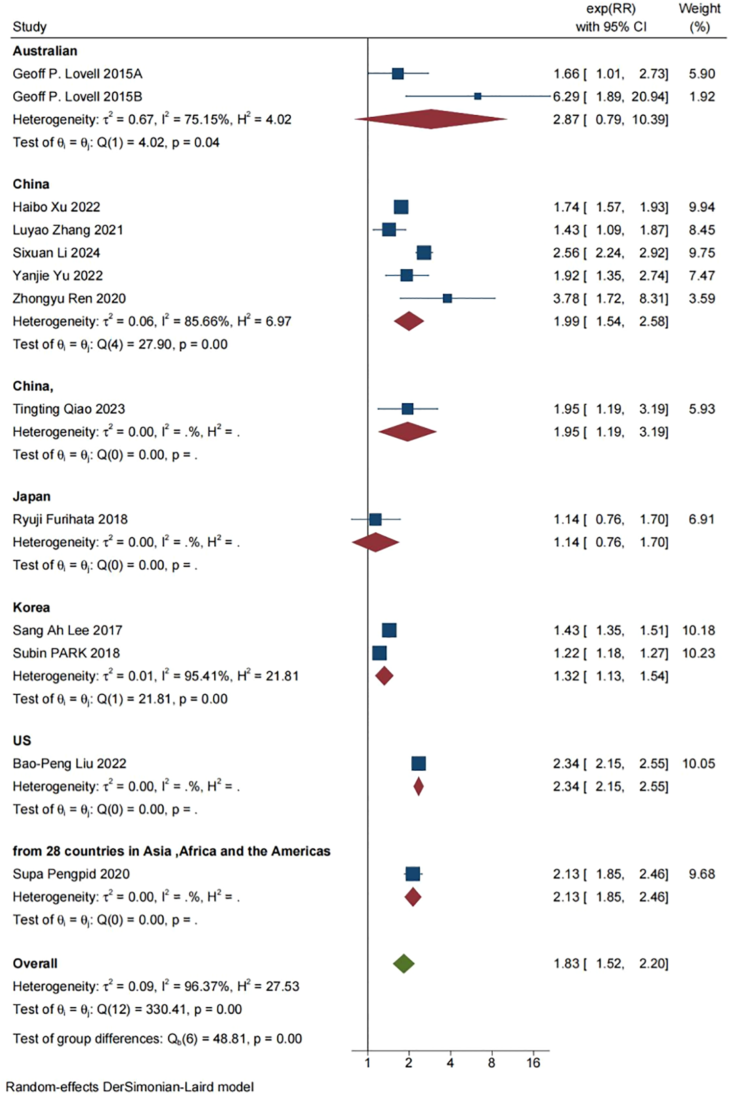 Subgroup analysis of the relevant regions of the selected literature (Concentrated in China, it showed a significant association with depression risk in all countries except Australia and Japan).