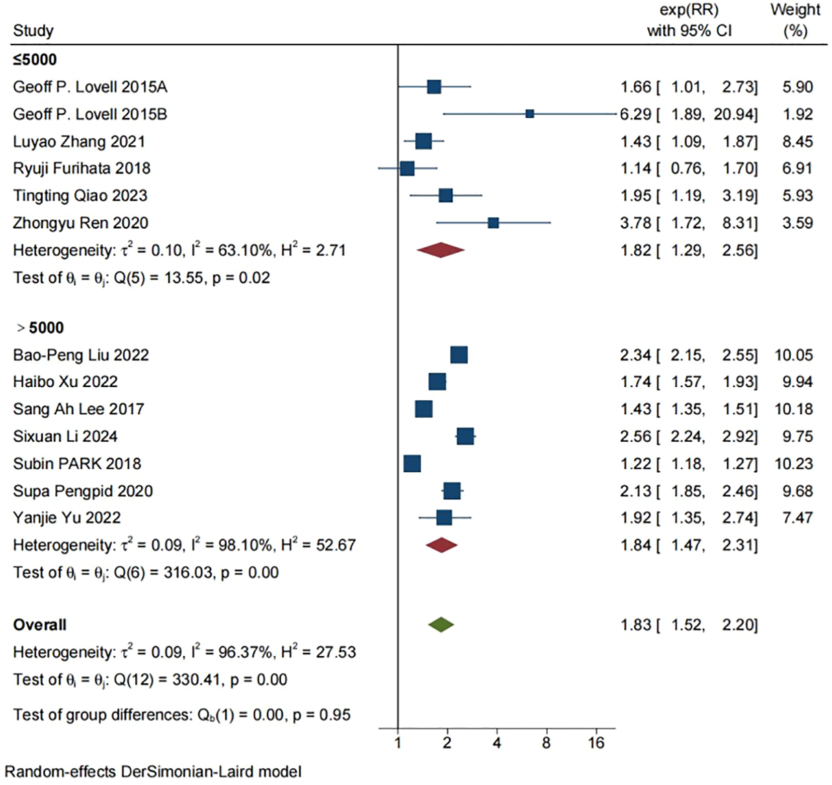 ![Forest plot from a meta-analysis comparing studies with sample sizes less than or equal to 5000 and greater than 5000. Each study shows a risk ratio (RR) with a 95% confidence interval and a weight percentage. The plot includes individual study estimates and summary diamonds indicating pooled estimates for each group and overall. Studies with sample sizes greater than 5000 show more heterogeneity. The overall pooled estimate favors the intervention, with an RR of 1.83 (95% CI [1.52, 2.20]).](https://www.frontiersin.org/files/Articles/1548282/xml-images/fpsyt-16-1548282-g004.webp)