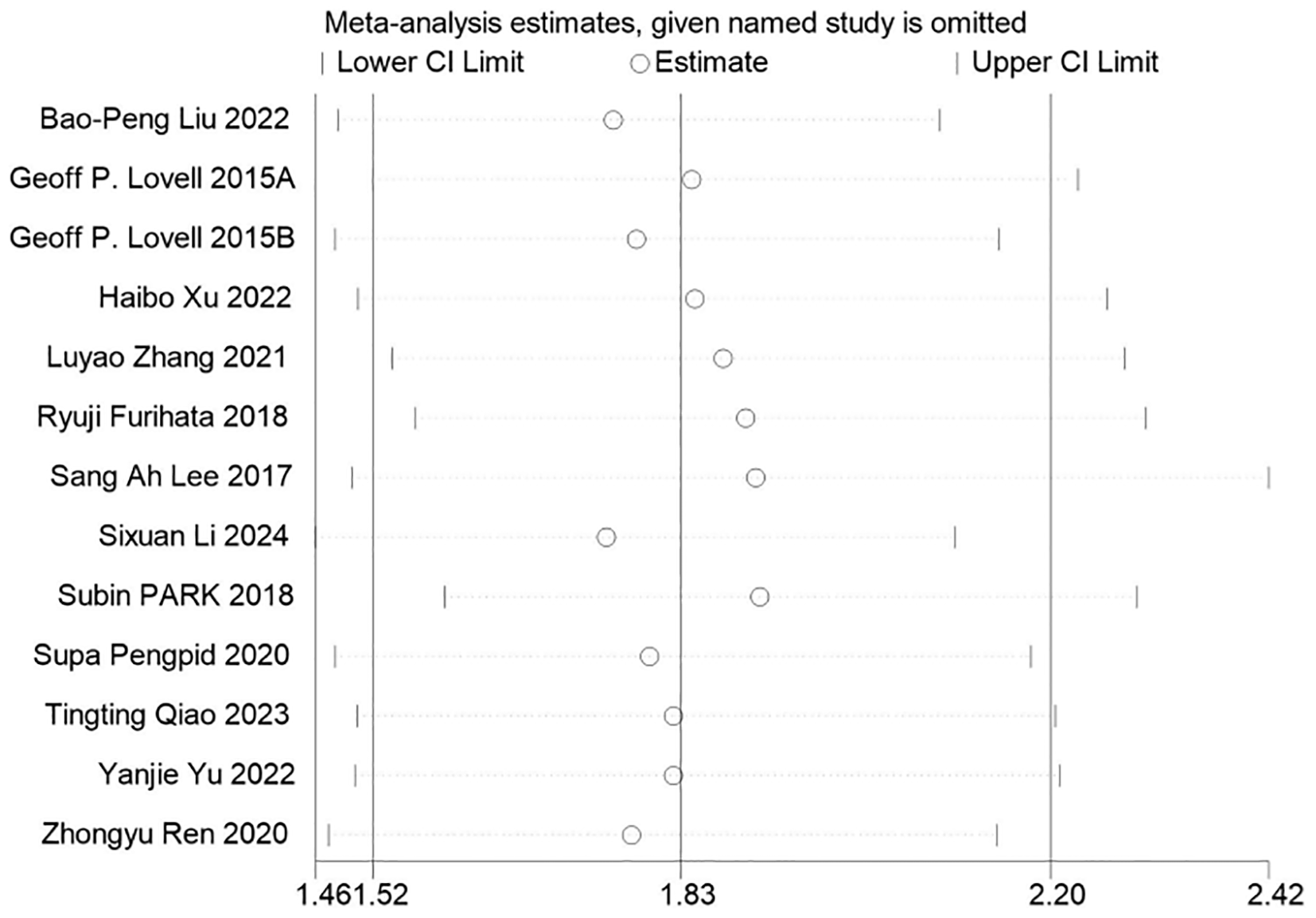 PubMed, Embase, and Web of Science databases were searched(the retrieval time limit for all was from the establishment of the databases to September 1, 2024), English documents were selected from the databases(the research type was observational study), and then the data was extracted and the Newcastle-Ottawa Scale(NOS) was evaluated for data analysis of the selected studies. This study followed the guidelines of the Preferred Reporting Project (PRISMA) and Prospero Registration Agreement. The mixed-effects model combines the maximum adjusted estimates and measures heterogeneity using the I2 statistic. Sensitivity analysis verified the robustness of the analysis and assessed publication bias.