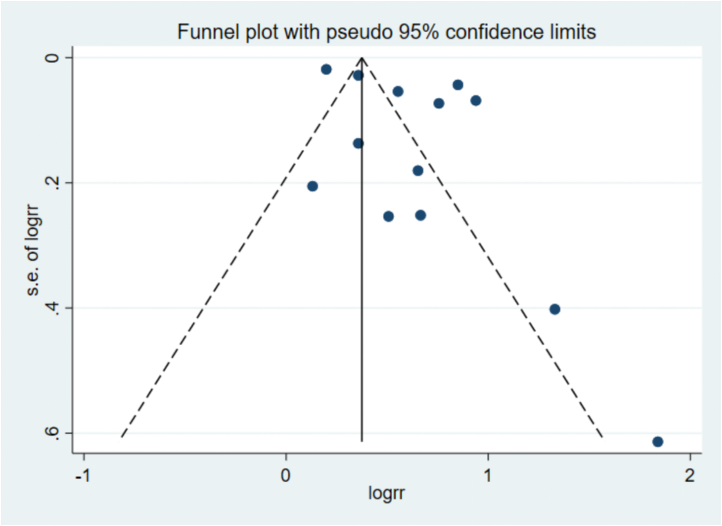 In this study, publication bias analysis was carried out on the included studies, and the analysis results showed that: In the analysis of the association between skipping breakfast and the risk of depression, Figure 7 showed that the data distribution was roughly symmetric and the data were relatively concentrated, and the Egger test P=0.067 > 0.05 showed no significant publication bias.