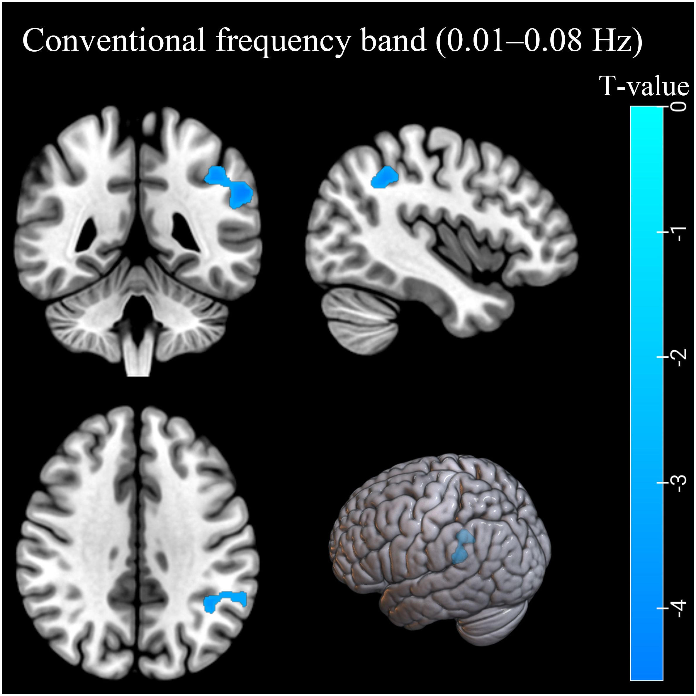 Figure 1. The ReHo differences in the conventional band (0.01–0.08 Hz) between AUD patients and HCs. Blue denotes lower ReHo values in AUD patients compared to HCs. ReHo, regional homogeneity; AUD, alcohol use disorder; HCs, healthy controls.