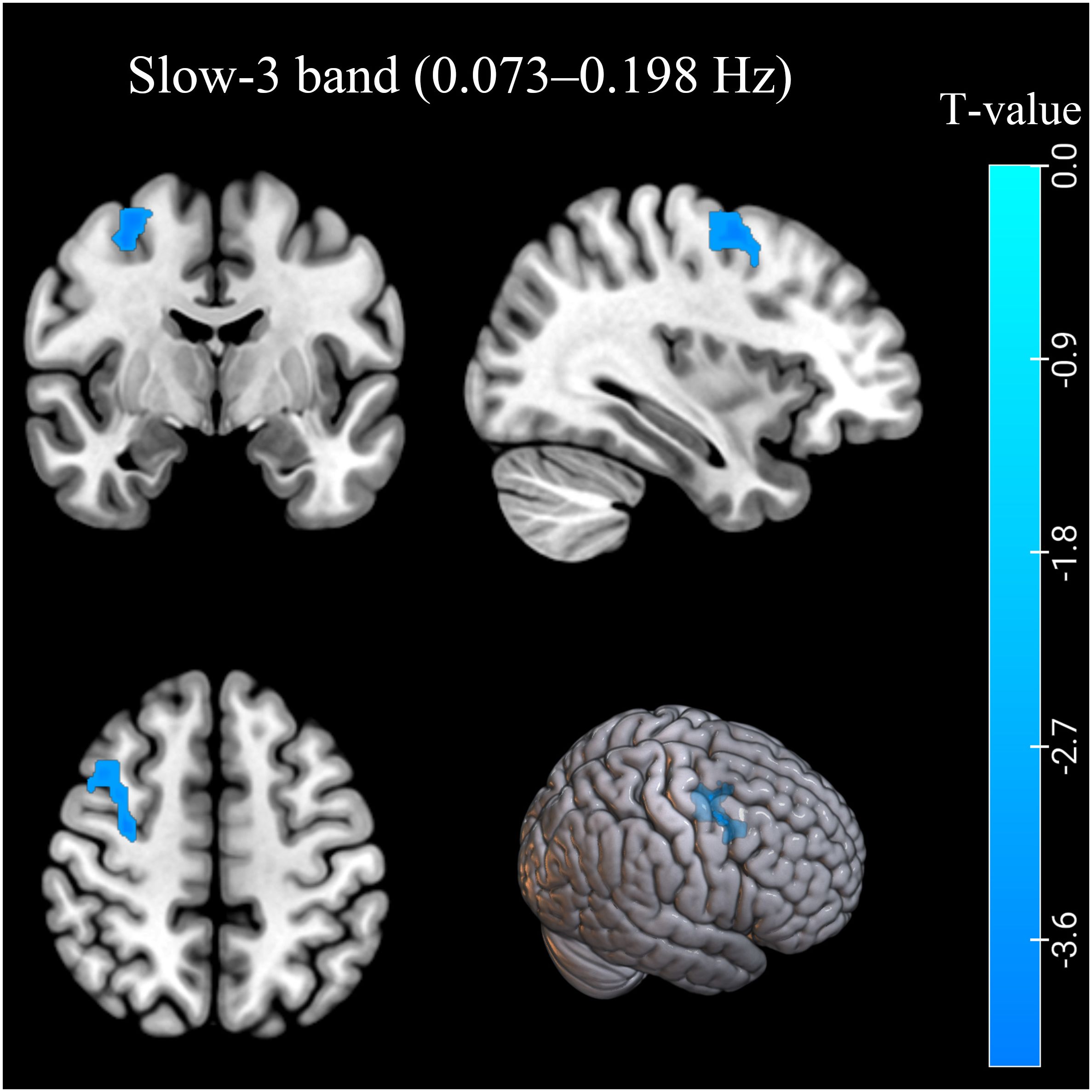 Figure 2. The ReHo differences in the slow-3 band (0.073–0.198 Hz) between AUD patients and HCs. Blue denotes lower ReHo values in AUD patients compared to HCs. ReHo, regional homogeneity; AUD, alcohol use disorder; HCs, healthy controls.