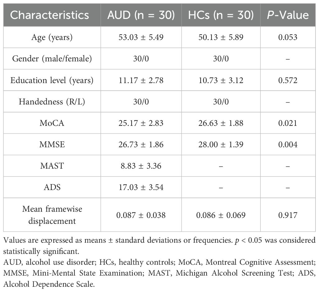 No participants were excluded following correction for head motion. Finally, 30 AUD patients and 30 HCs were included in this research. The clinical information of the two groups is shown in Table 1. In terms of gender, age, education, handedness, and mean Framewise Displacement (FD) , no statistically significant difference was found. Nonetheless, the MMSE and MoCA scores of the AUD group were considerably lower (p < 0.05) than those of the HC group.