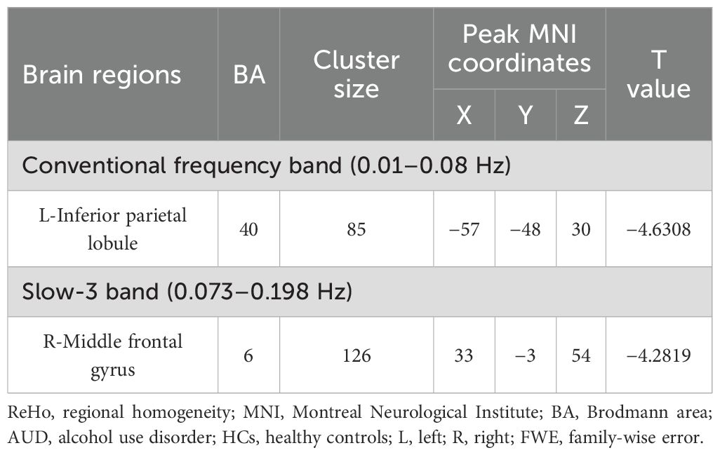 Table 2. The ReHo difference in each frequency band between patients with AUD and HCs (p < 0.05, cluster-level FWE corrected).
