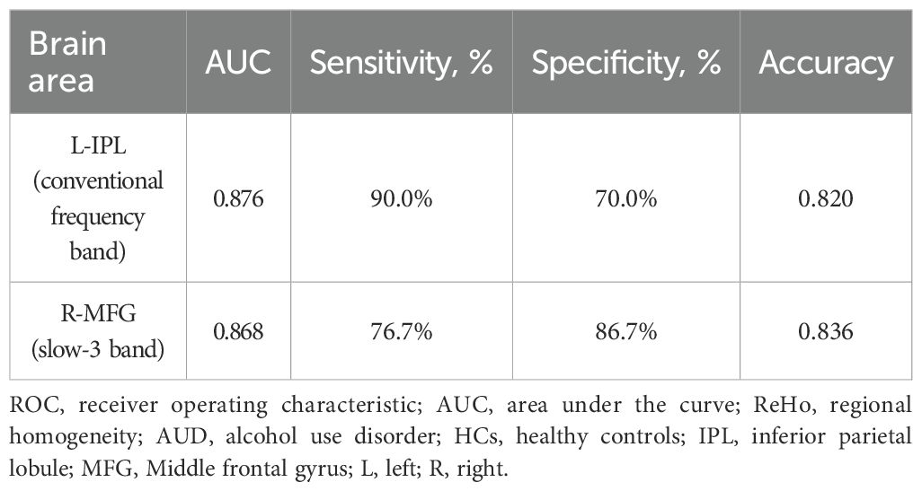 According to our research, the ROC curve showed good AUC values (range 0.868–0.876) for ReHo values in various bands. Further diagnostic study found that the ReHo values can distinguish the AUD patients from the HCs with good sensitivities (range 76.7%–90.0%) and specificities (range 70.0%–86.7%) (Table 3; Figure 3).