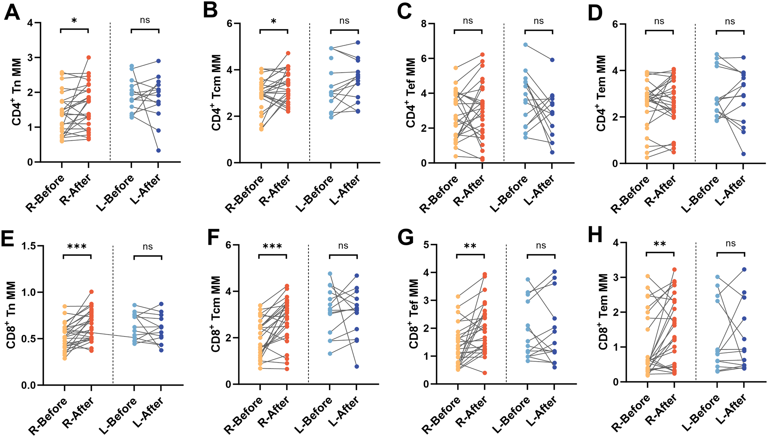 Changes in MM in depressed patients hospitalized for less than 21 days. Differences in MM of (A) CD4+Tn, (B) CD4+Tcm, (C) CD4+Tef, (D) CD4+Tem, (E) CD8+Tn, (F) CD8+Tcm, (G) CD8+Tef, and (H) CD8+Tem before and after treatment in routine-term hospitalization and long-term hospitalization group groups. R, Routine-term hospitalization group; L, Long-term hospitalization group, *P < 0.05; **P < 0.01; ***P < 0.001; ns P > 0.05.