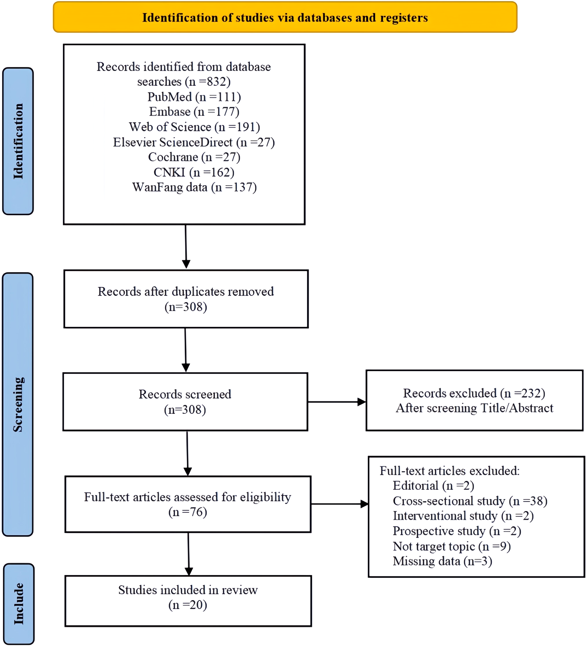 This study systematically searched major domestic and international databases, resulting in a total of 832 articles. After removing duplicates using EndNote software, 308 articles remained. After reading the titles and abstracts, 232 articles were excluded. After reading the full text, 56 articles were excluded, leaving 20 articles for inclusion, including 15 psychometric studies, two cross-sectional studies, one qualitative methodology, one review study and one Delphi study. Additional characteristics of the included studies were shown in Supplementary Material 4. The literature search process is shown in Figure 2.