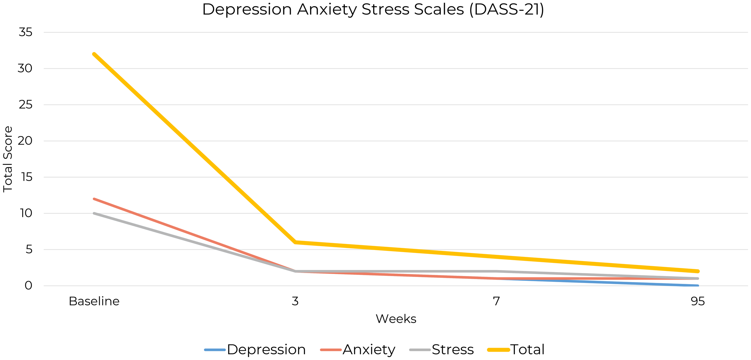 By Week 3, the patient’s total score had decreased to 6, with subscale scores of depression 2, anxiety 2, and stress 2, all within the ‘normal’ range for each subscale, reflecting minimal distress. By Week 7, his total score had further decreased to 4, with subscale scores of depression 1, anxiety 1, and stress 2 demonstrating continued improvement. The final score at extended follow-up was 2, which remained well within the ‘normal’ range, with subscale scores of depression 0, anxiety 1, and stress 1, indicating sustained recovery over a nearly two-year period (Figure 2).
