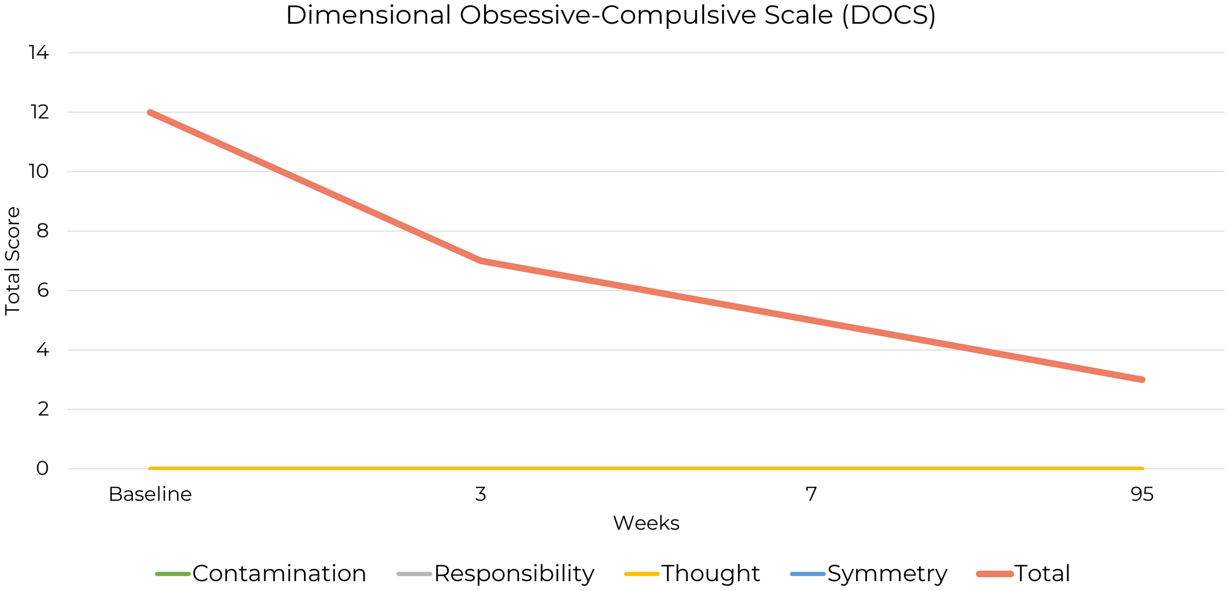 It is of clinical note that the patient’s highest total DOCS score was 12, which falls below the cutoff score of 21 used to differentiate OCD from other conditions. However, this total score did not fully capture the severity of the patient’s symptoms, as they were exclusively confined to the symmetry/order dimension. The low total score is a result of minimal symptom expression in the other three dimensions assessed by the DOCS. Therefore, in this case, the subscale score provides a more accurate reflection of the patient’s condition at baseline (Supplementary Table 1).