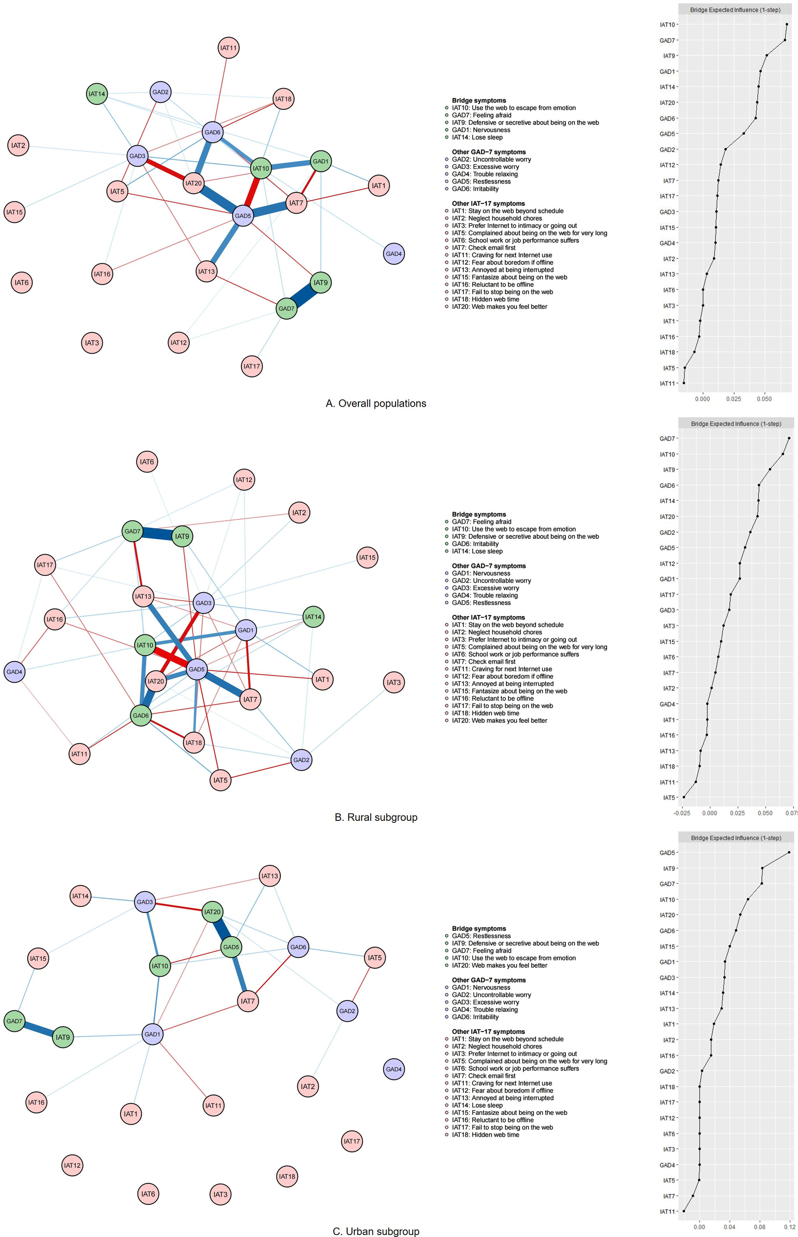 The study included 60,268 adolescents (mean age 15.90 ± 1.65 years; 54.44% females), stratified by residence: rural (n = 49,819) and urban (n = 10,449). In the general network, “Fantasize about being on the web” (IAT15), “Neglect household chores” (IAT2), and “Reluctant to be offline” (IAT16) were the most influential symptoms. Bridge network analysis revealed that “Use the web to escape from emotion” (IAT10), “Feeling afraid” (GAD7), and “Defensive or secretive about being on the web” (IAT9) served as key connectors that bridge the comorbid network of anxiety and IA. The network structure test detected residence-related differences, and the most influential and bridging symptoms diverged by residence. “Craving for next Internet use” (IAT11) and “Irritability” (GAD6) characterized rural adolescents, whereas “Excessive worry” (GAD3) and “Restlessness” (GAD5) typified urban adolescents.