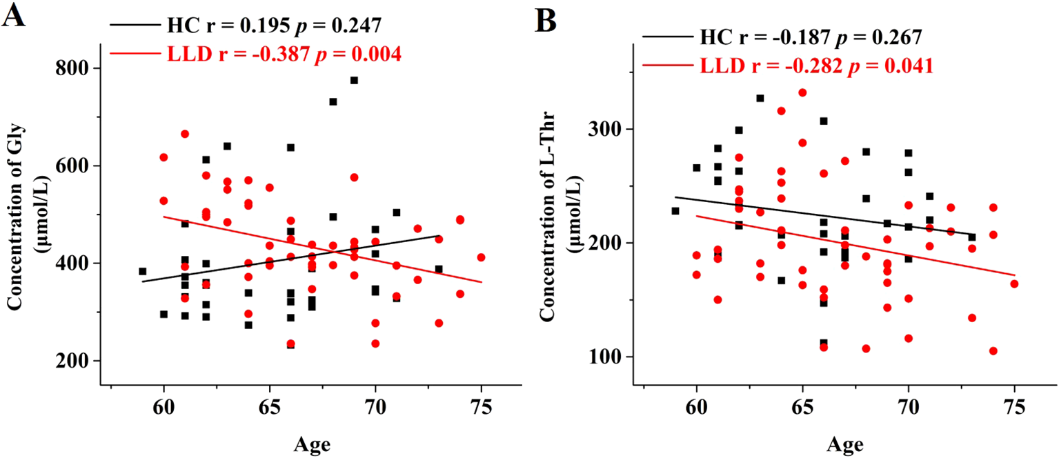 Age-dependent changes in the serum levels of Gly and L-Thr in LLD and HCs groups. Correlation analysis of age with (A) Gly levels and (B) L-Thr levels in the serum samples of HCs (black) and LLD (red).