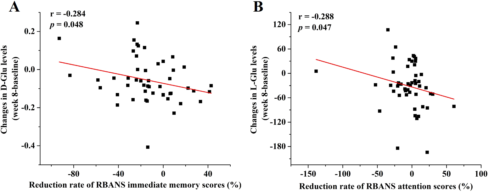 To assess the relationship between changes in key amino acid levels and improvements in LLD symptoms as measured by the HAMD-17 and RBANS scales after 8 weeks of antidepressant treatment, Pearson or Spearman correlation analysis was performed. As shown in Figure 4, changes in D-Glu levels were significantly correlated with reductions in the RBANS immediate memory scores (r = -0.284, p = 0.048), and changes in L-Glu levels were significantly associated with reduced scores for RBANS attention scores (r = -0.288, p = 0.047). No significant correlations were found between other amino acids of interest and LLD symptom scores.