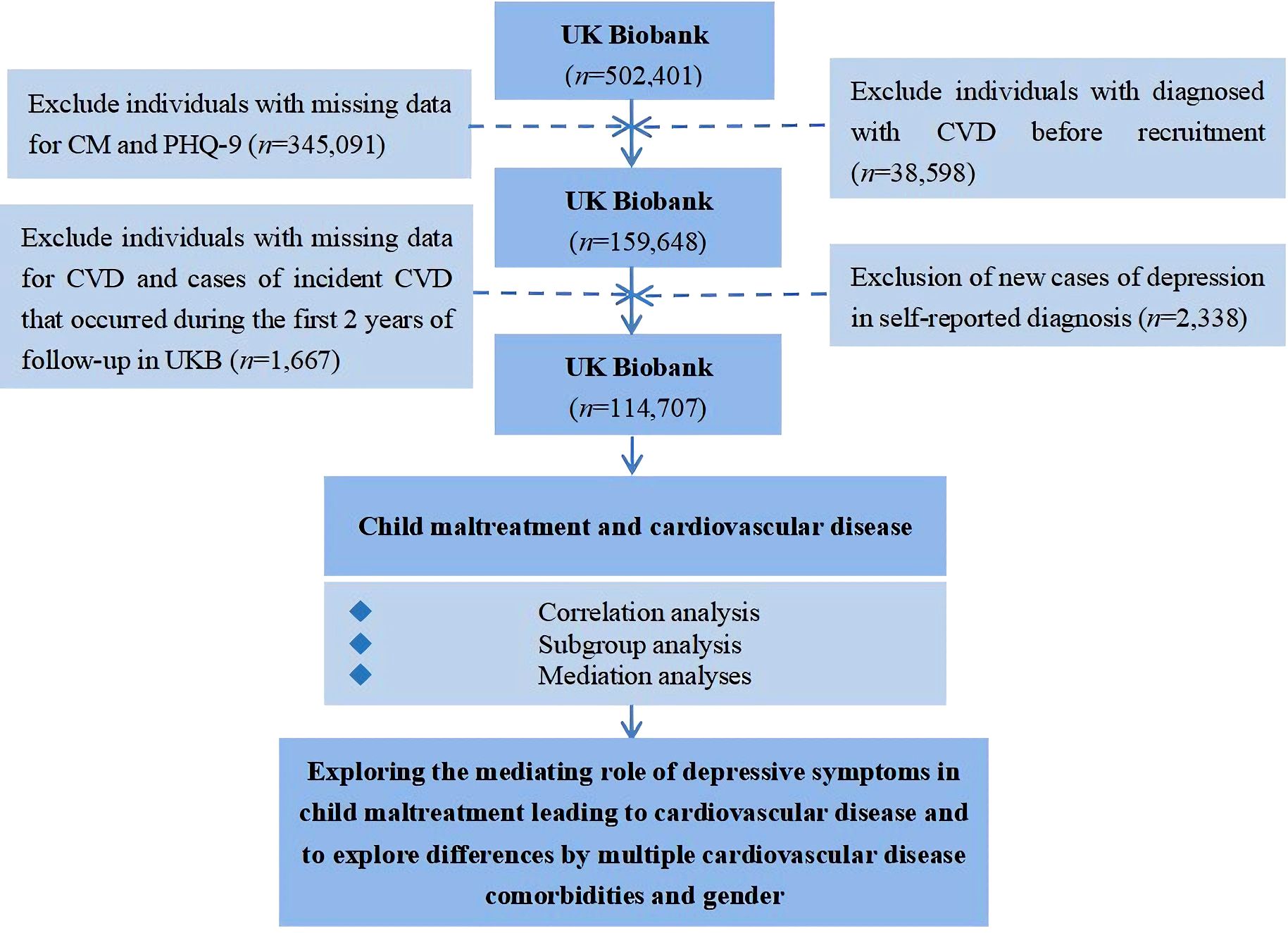 Objective: Childhood maltreatment (CM) increases the risk of cardiovascular disease (CVD), but the mediating mechanism of depressive symptoms in this process has not been fully elucidated. To further elucidate the potential mechanisms of depression in the association between CM and CVD, this study aimed to investigate the mediating role of depressive symptoms in a UK biobank cohort.