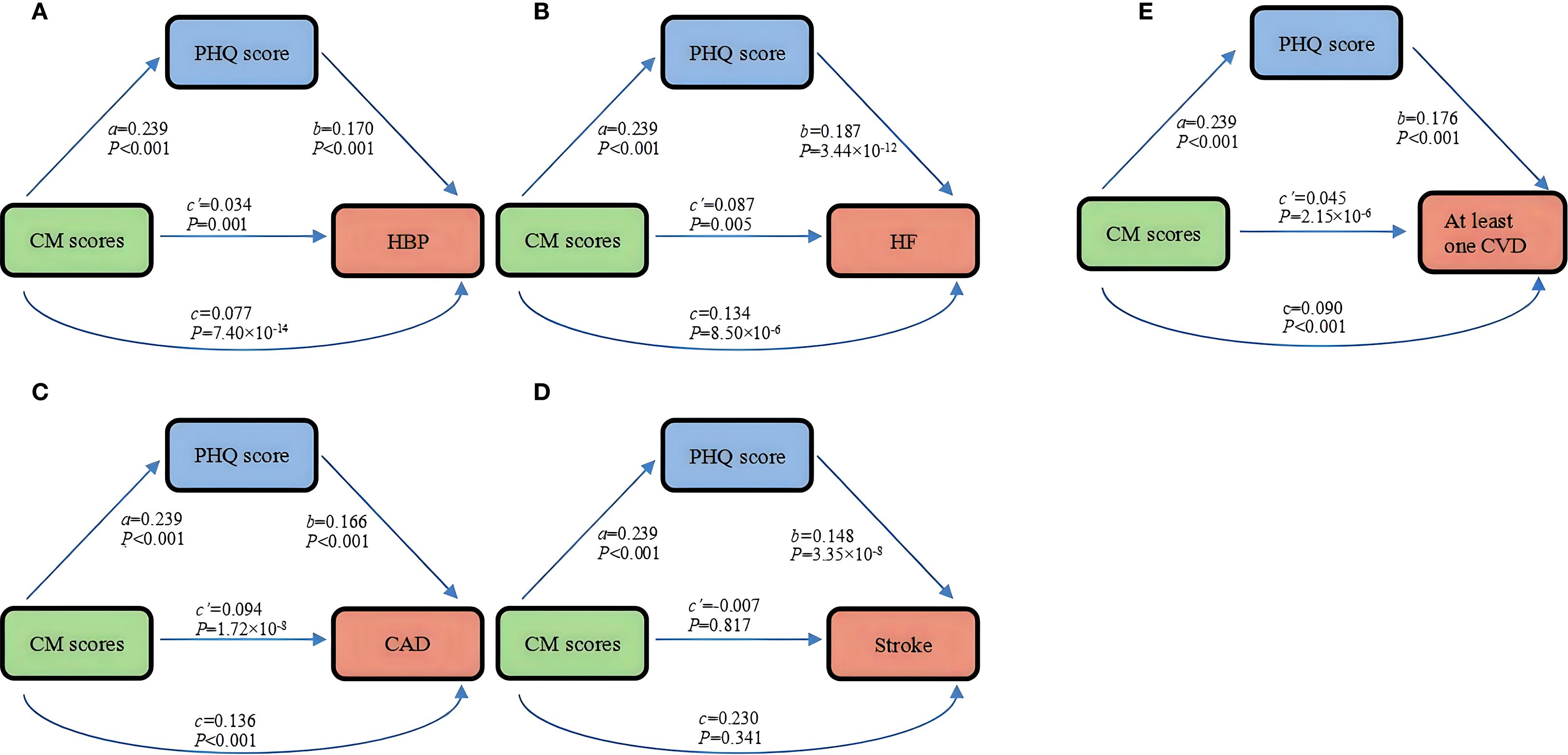 Figure 2. Mediation effect of depressive symptoms in the association between CM and single or at least one CVD in all cohorts: (A) hypertension, (B) heart failure, (C) at least one CVD, (D) coronary artery disease, (E) stroke. HBP, hypertension; HF, heart failure; CAD, coronary artery disease; CVD, cardiovascular diseases; CM, childhood maltreatment; PHQ-9, Patient Health Questionnaire 9-item.