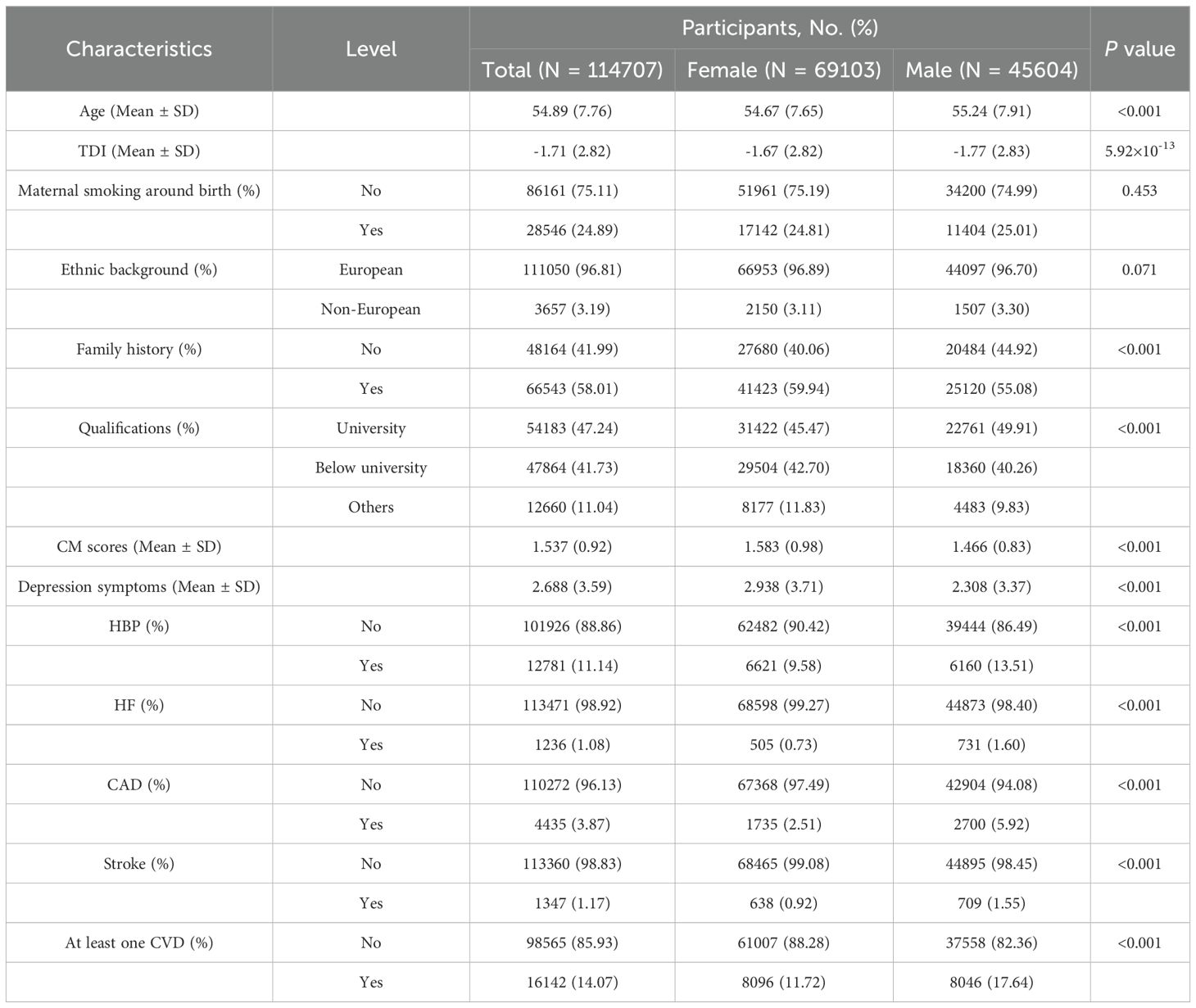 Gender differences in baseline characteristics for the 114,707 UK Biobank participants are summarized in Table 1. Female exhibited higher levels of CM score and depressive symptoms, as well as greater prevalence of HBP and any CVD, while male showed higher rates of HF, coronary artery disease, and stroke. Female were also more likely to report maternal smoking during pregnancy, family history of CVD, and socioeconomic deprivation—factors that may contribute to differential cardiovascular risk trajectories by gender.