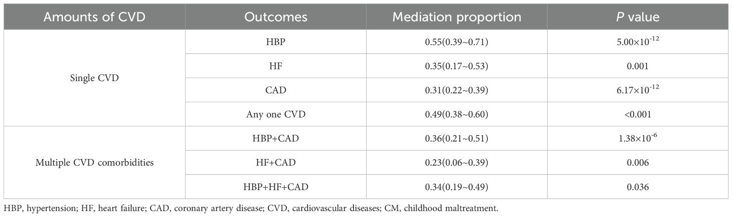 Our study also has limitations. First, in terms of variable selection, we assessed CM using retrospective measures, which may be affected by measurement and recall bias (41). For example, individuals with current mental or physical health conditions may be more likely to recall or emphasize past adverse experiences. This may inflate the observed associations between CM and later outcomes such as depression or cardiovascular disease, potentially introducing upward bias. Conversely, underreporting due to repression or normalization of trauma could attenuate associations; confounders such as marital status, biomarkers, and relationship with parents were not considered, which may have affected our results (5). Due to the observational design, residual confounding and reverse causality cannot be fully ruled out, and findings should be interpreted with caution. Given the small sample sizes for individual CVDs such as heart failure and stroke, the significant differences in test results may indicate insufficient validity of the analyses. While this exclusion may introduce healthy-participant bias, it strengthens the validity of the assumed causal sequence in our mediation analysis.