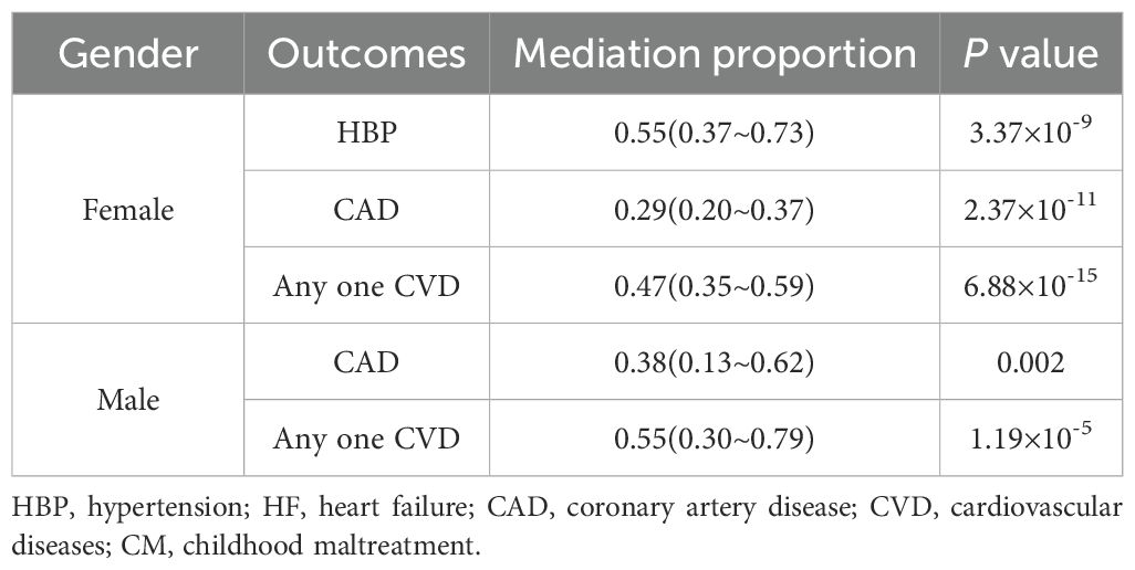 We interpret these findings as compared to a single CVD, the depression symptoms explained to varying degrees the correlation between CM score and CVD comorbidities (21.43%~34.21%). We consider that the reason for this result may be due to the diversity of multiple CVD comorbidities, which may result in other pathological, physiological (inflammation, blood lipids, etc.), and neurobiological factors playing a more significant role, thus masking the mediating effect of some depression (35). However, in males, the mediating proportion of depressive symptoms between CM and CVD is higher, suggesting potential sex-specific pathways in the psychological sequelae of childhood maltreatment. Combined with the previous discussion on gender differences between CM and CVD, there may be other common factors that play a mediating role, which may require further research (36). Psychosocial factors may play a smaller role in stroke or its onset. These gender differences may reflect, in part, higher stress sensitivity and greater likelihood of internalizing responses among females, which is also congruent with recent evidence on behavioral pathways to cardiovascular risk (37). Because the total and direct effects between CM scores and some CVDs (e.g., stroke, HF, etc.) were not significant, we hypothesized that there was no mediating effect. Although we adjusted for a range of pre-exposure and time-varying covariates—including age, sex, socioeconomic status, childhood home environment, and parental history of CVD—residual confounding cannot be fully ruled out. While these adjustments help strengthen the validity of the estimated mediation pathways, the possibility remains that underreporting of diseases or lack of corroborating evidence may affect the findings. Therefore, establishing triple sequential causality is essential for confirming these associations.