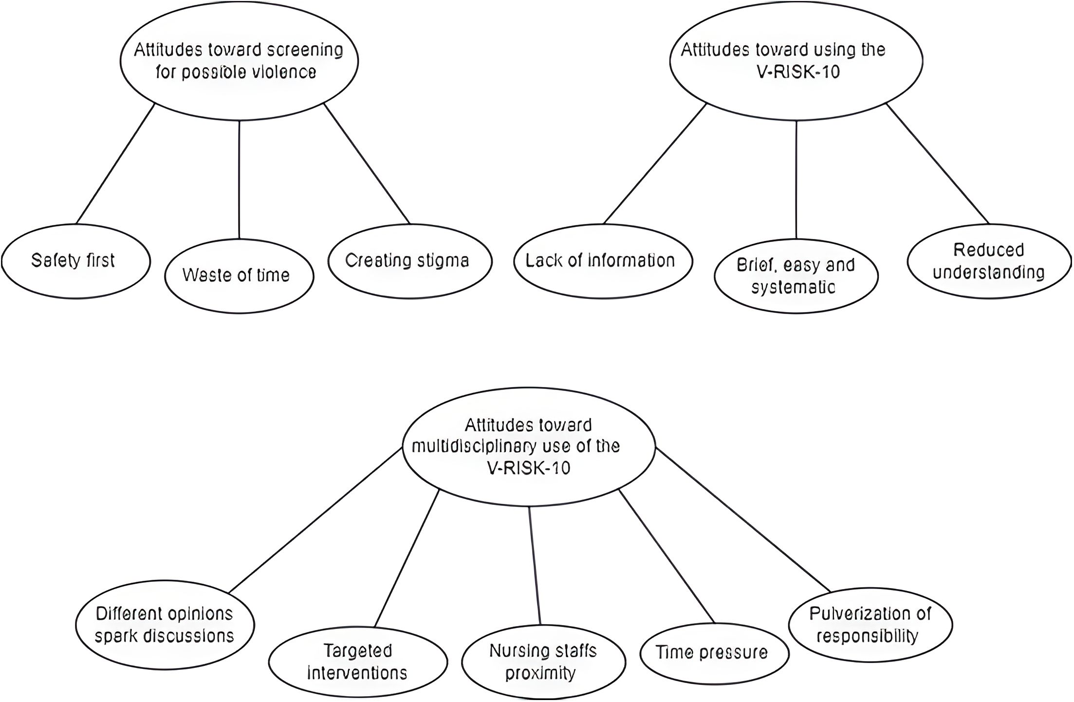 Results: Three overarching themes were identified: 1) attitudes toward screening for possible violence, 2) attitudes towards using the V-RISK-10 and 3) attitudes toward multidisciplinary use of the V-RISK-10. In summary, subthemes revealed that screening was perceived as important, and participants perceived the tool in question as quick and systematic yet noted that missing information on the day of admittance was problematic. Important discussions were sparked and targeted interventions initiated as a result of multidisciplinary collaboration.