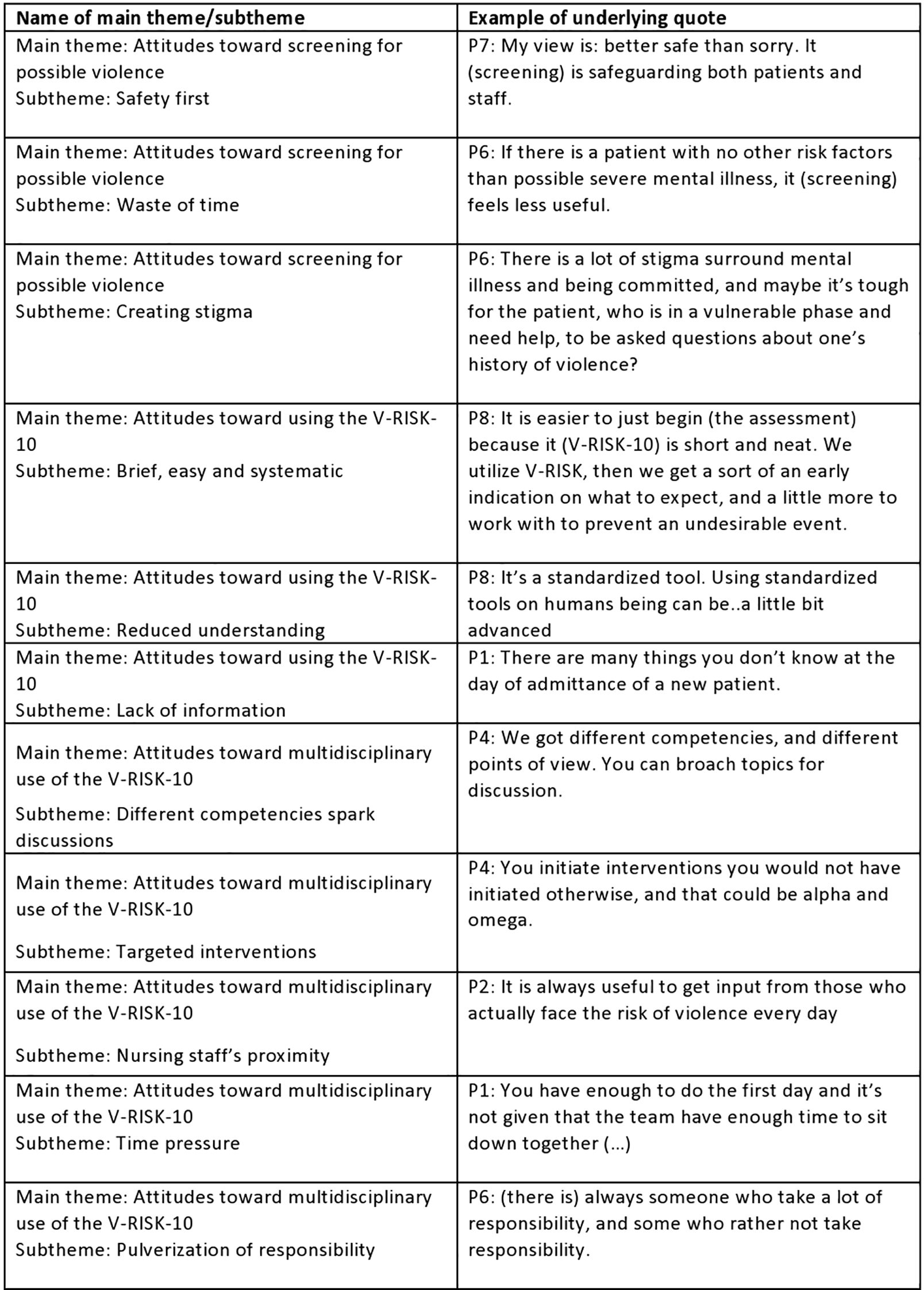 “You lose important factors, intrapersonal factors and dynamic reasoning around violence and the patient. The main challenge with it (the V-RISK-10), which is also its strength, is that it’s standardized, and you risk compromising the dynamic understanding of the patient and violence, maybe” [P1].