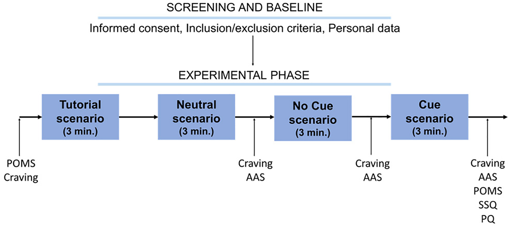 The study consisted in a single session lasting approximately 45 mins. Participants filled out the Profile of Mood States (POMS) questionnaire before and after the session as a pre-VR baseline measure concerning their mood and affective state. After a 3-minute VR baseline, we administered three scenarios, each lasting 3 minutes. After the baseline and each of the scenarios, subjects were required to fill out the VAS to report craving, and a modified version of the Alcohol Attention Scale (AAS) questionnaire. At the end of the experimental session, in addition to the POMS, subjects were also asked to fill in the Presence Questionnaire (PQ) to assess their sense of presence, and the Simulator Sickness Questionnaire (SSQ) to assess the presence of possible adverse effects due to VR exposure.