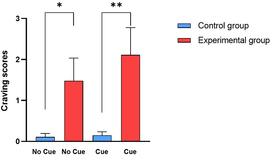 The Mann-Whitney on craving scores showed greater craving in the experimental group than in the control group in both the No Cue scenario (U = 290.5, p = 0.031) and the Cue scenario (U = 248, p = 0.006) (Figure 4). In contrast, the Mann-Whitneys of AAS 1 and AAS 2 did not reveal significant differences.